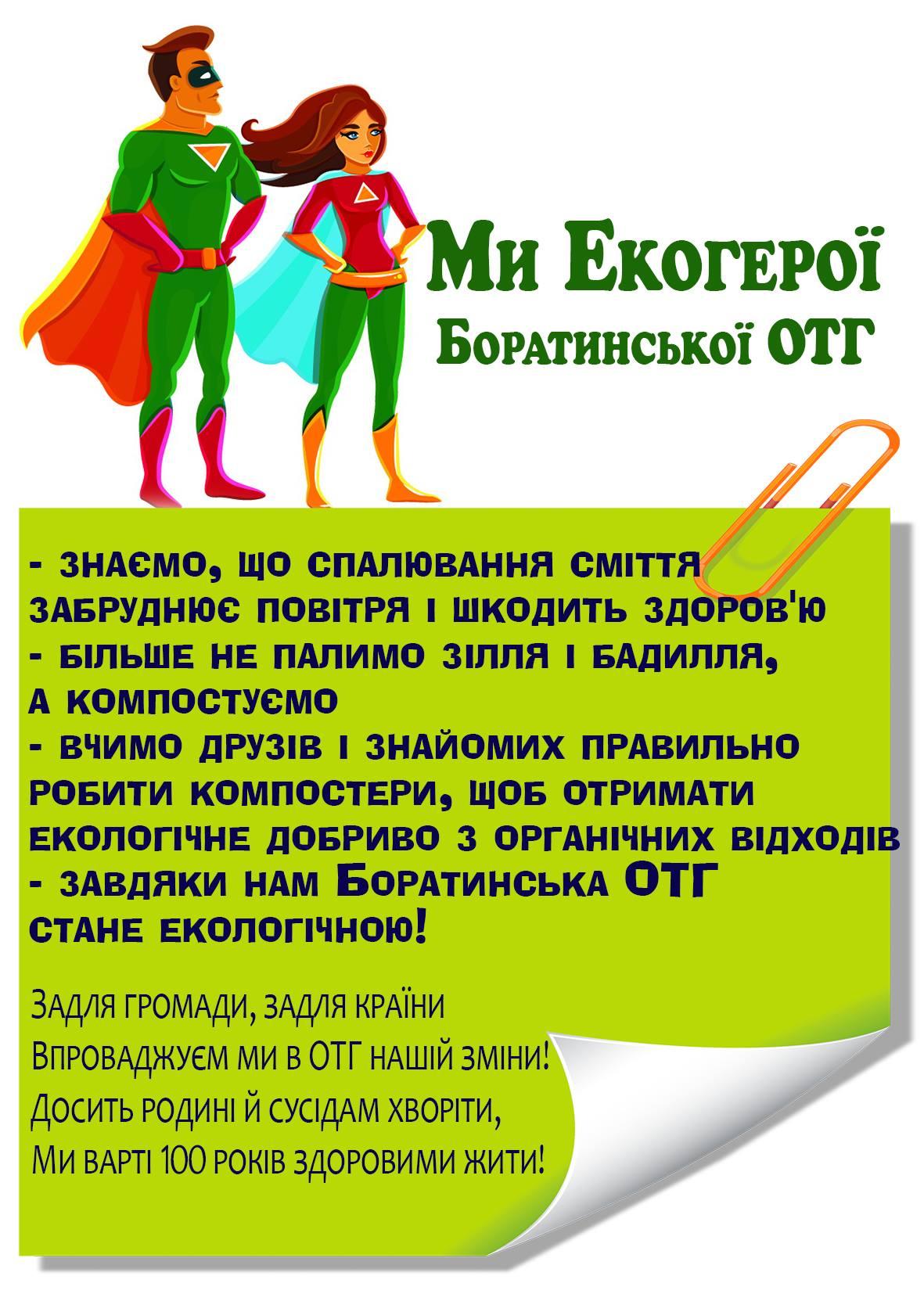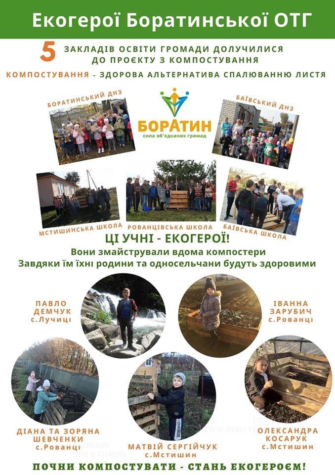 У 2019 році в Боратинській громаді розпочали реалізацію проекту «ЕкоГромада: шлях змін». Ініціатива має на меті формування еко-свідомості громади шляхом переходу від паління до компостування. До команди проекту увійшли волонтери-активісти: дитяча письменниця Наталія Гуркіна, експерт з компостування, виробник будівель з соломи Сергій Качкало, екопсихолог, практик еко-проектів Михайло Мельницький та представники громади – начальник відділу соціально-економічного розвитку Анатолій Левчук, вчителька Мстишинської школи Ольга Сергійчук. Майданчиками для впровадження пілотного проекту стали 5 закладів освіти громади – Рованцівська школа, Баївська школа, Мстишнська школа, Боратинський та Баївський дошкільні навчальні заклади.