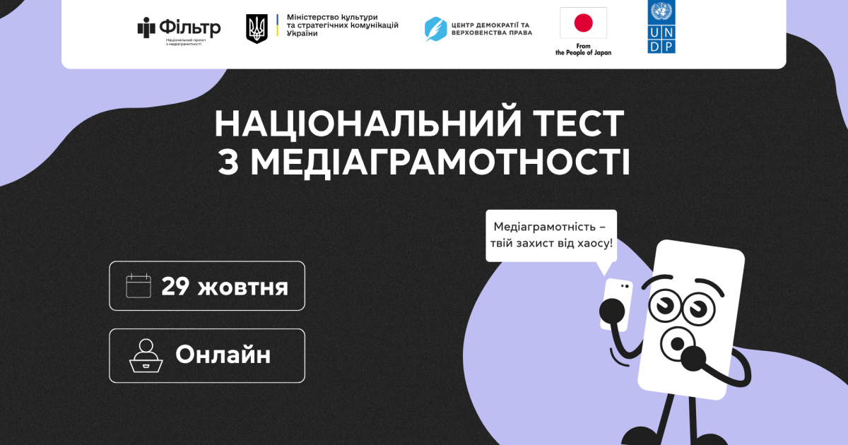29 жовтня о 09:30 в Україні розпочнеться щорічний Національний тест із медіаграмотності, який уже вчетверте організовує Національний проєкт з медіаграмотності «Фільтр» Міністерства культури та стратегічних комунікацій України.