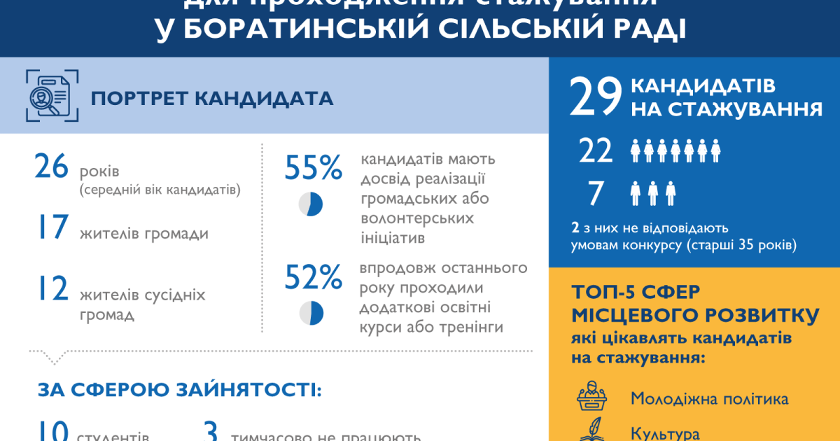 Цікаво, що з-поміж 29 охочих проходити стажування у Боратинській сільській раді виявилося 17 жителів громади, тоді як решта 12 – жителі сусідніх громад, середній вік кандидатів складає 26 років. Серед бажаючих стажуватися в органі місцевого самоврядування – представники різних сфер зайнятості: студенти, менеджери, викладачі, адміністратори, тимчасово безробітні, маркетолог, ландшафтний архітектор, журналіст, службовець ЗСУ, працівник ОМС, фотограф-ретушер, вчитель, касир, художній керівник, мама у декретній відпустці.