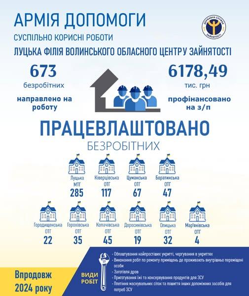 Луцька філія Волинського обласного центру зайнятості активно долучає безробітних осіб до працевлаштування на суспільно корисних роботах. Усього протягом року роботу отримало 673 особи, 47 з яких це мешканці Боратинської громади.