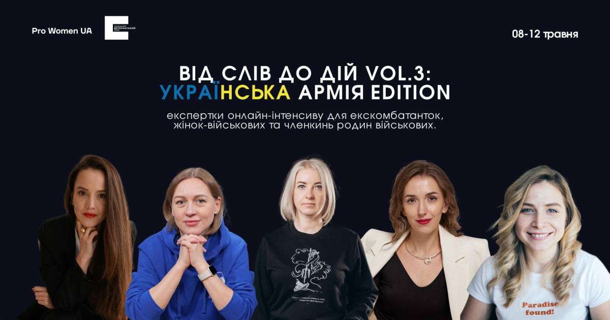 Жіноча спільнота Pro Women UA та Український ветеранський фонд запускають онлайн-інтенсив для екскомбатанток, жінок-військових та членкинь родин військових «Від Слів до Дій vol.3: українська армія edition». Це онлайн навчання про те, як втілити в життя ідею про бізнес, громадську або волонтерську організацію чи сімейну справу.