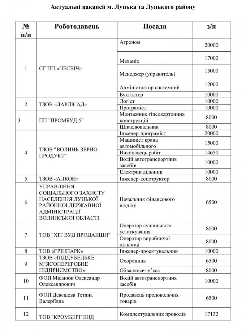 Волинський обласний центр зайнятості інформує про перелік актуальних вакансій, зареєстрованих у Луцькій районній філії. Із переліком вакансій та відомостями щодо заробітної плати можна ознайомитися нижче.
