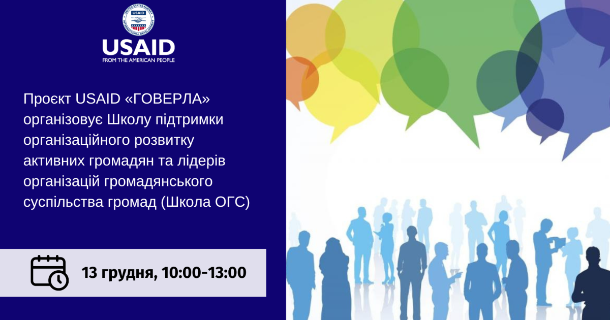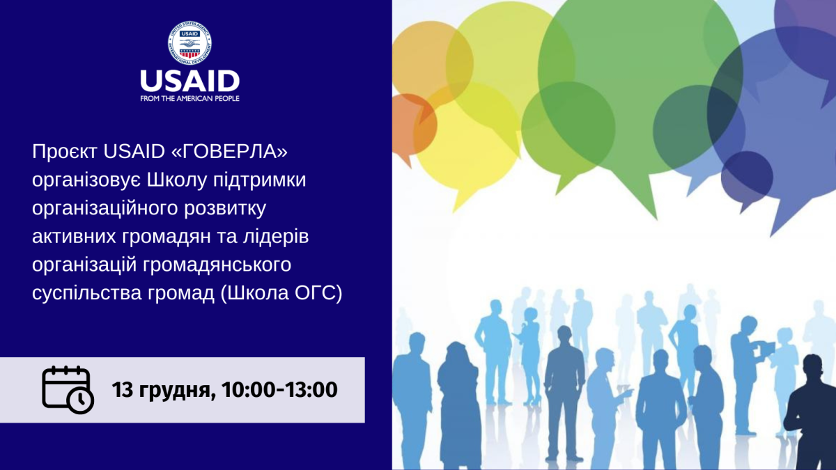 В період з грудня 2023 р. по червень 2024 р. Проєкт USAID «ГОВЕРЛА» організовує серію навчальних заходів Школи підтримки організаційного розвитку активних громадян та лідерів організацій громадянського суспільства громад, які співпрацюють з Проєктом USAID «ГОВЕРЛА» (далі — Школа ОГС).
