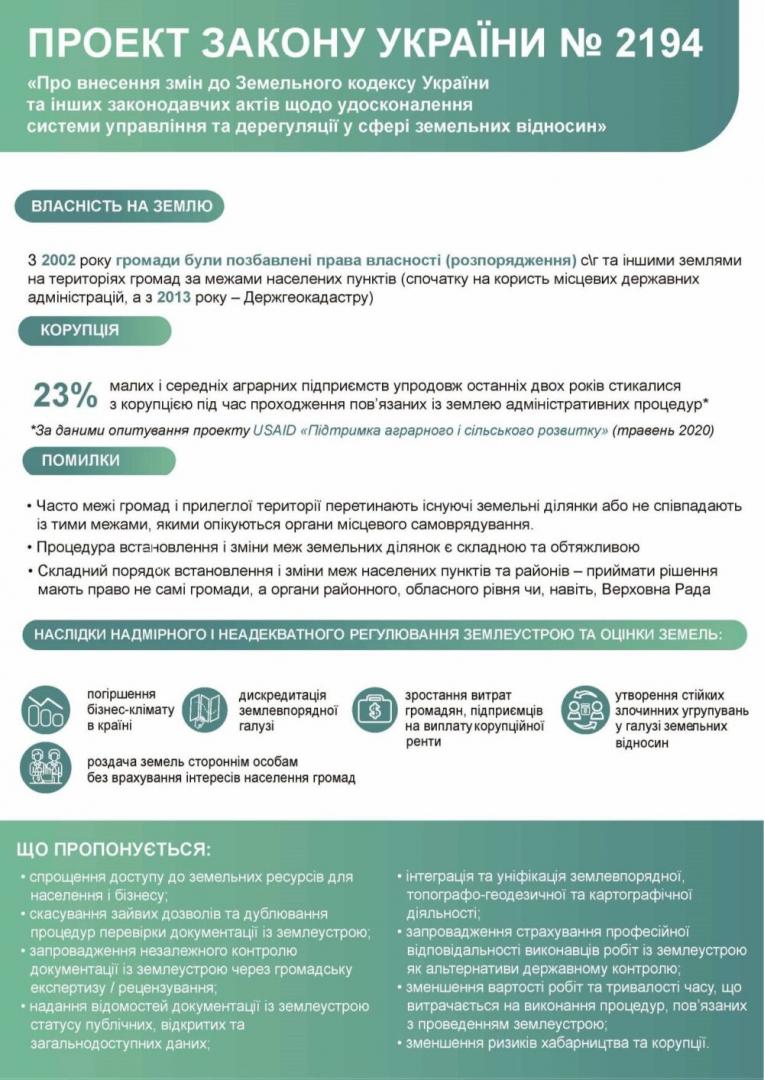 В Асоціації наголошують, що нині у питаннях розпорядження землями громад за межами населених пунктів існує чимало проблем, які стримують розвиток місцевого самоврядування і дискредитують державу в очах населення. Серед них, зокрема, і передача органами державної влади земель стороннім особам без врахування інтересів жителів громад, неможливість юридично чітко встановити межі територій громад, обтяжливі, непрозорі та корупційно небезпечні процедури погодження документації із землеустрою та встановлення меж земельних ділянок на місцевості. Для вирішення цих проблем і розробили та внесли до Верховної Ради України законопроєкт №2194.