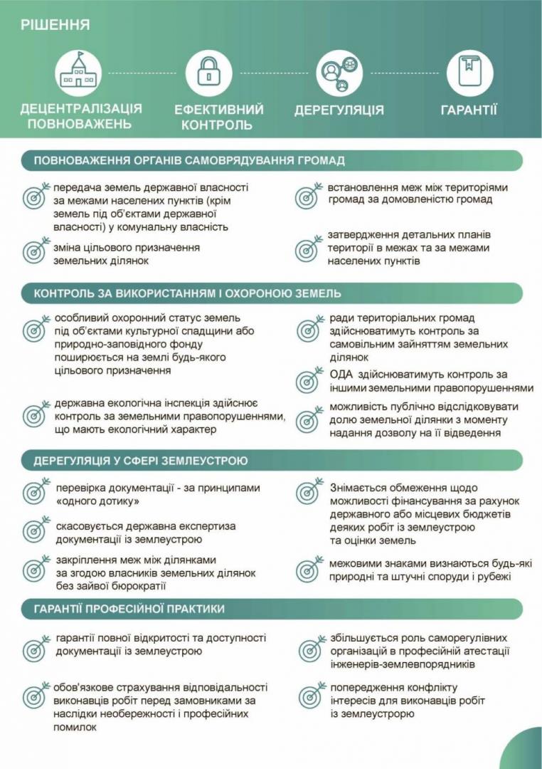 ► передачу землі державної власності за межами населених пунктів (крім земель, які потрібні державі для виконання її функцій) до власності територіальних громад, спрощення доступу до земельних ресурсів для громадян, бізнесу завдяки скасуванню зайвих дозволів, зокрема новостворених районних державних адміністрацій, та дублювання процедур перевірки документації із землеустрою;
