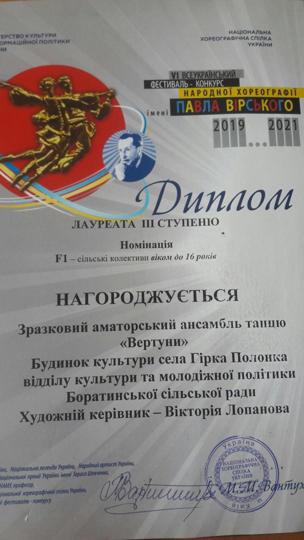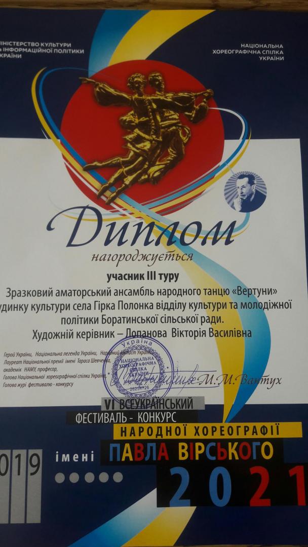 9 жовтня у місті Києві відбувся III тур Всеукраїнського фестивалю-конкурсу народної хореографії імені Павла Вірського. Це одне з найпрестижніших хореографічних змагань в Україні, що відбувається за ініціативи Національної хореографічної спілки України та за підтримки Міністерства культури України. Зразковий аматорський ансамбль народного танцю «Вертуни» (керівник – Вікторія Лопанова) став лауреатом ІІІ ступеню у номінації «Сільські колективи віком до 16 років», де змагалися десять фіналістів.
