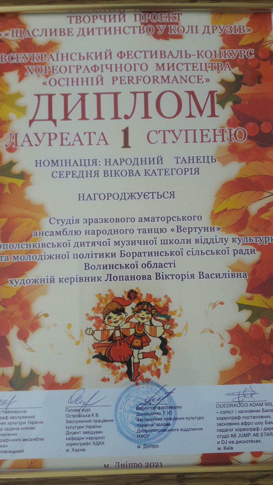 Додамо, що тріумфальному виступу «Вертунів» у Києві передувала ще одна перемога. Ансамбль став переможцем фестивалю-конкурсу хореографічного мистецтва «Осінній Performance», що відбувся наприкінці вересня у місті Дніпрі. Наші танцюристи стали лауреатом I премії та отримали особливу нагороду «Зірка фестивалю» у номінації «Народна хореографія».