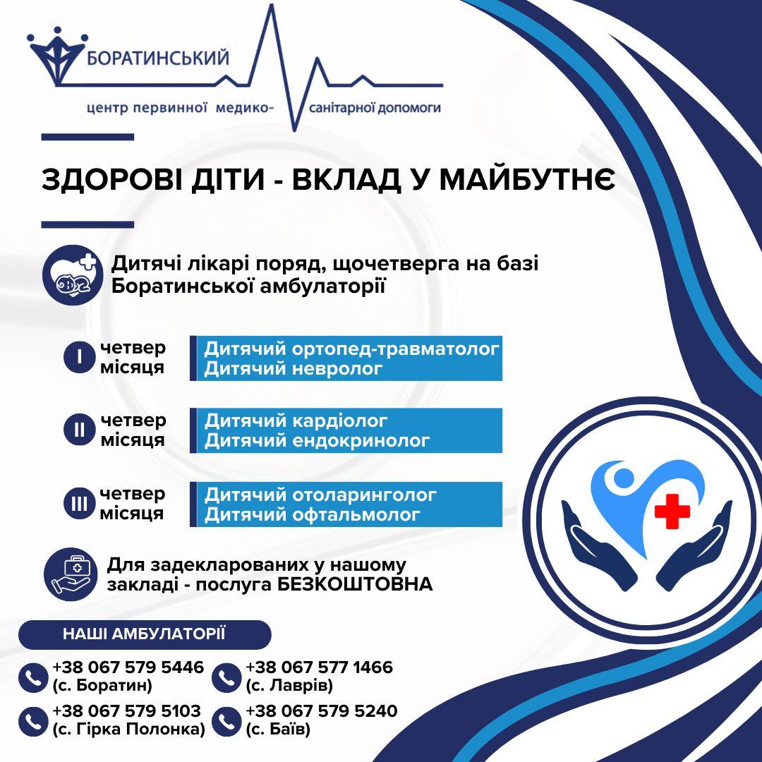 Завтра, 13 березня, о 13:00 на базі Боратинської амбулаторії здійснюватимуть прийом дитячі лікарі-спеціалісти.