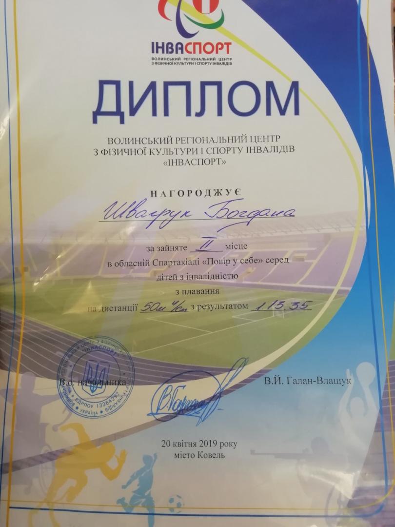 Богдана Швагрук виборола почесне друге місце з плавання на дистанції 50 м. Вітаємо юну спортсменку, бажаємо не зупинятися на досягнутому та підкорювати нові вершини у спорті та у житті.