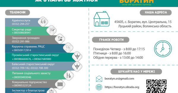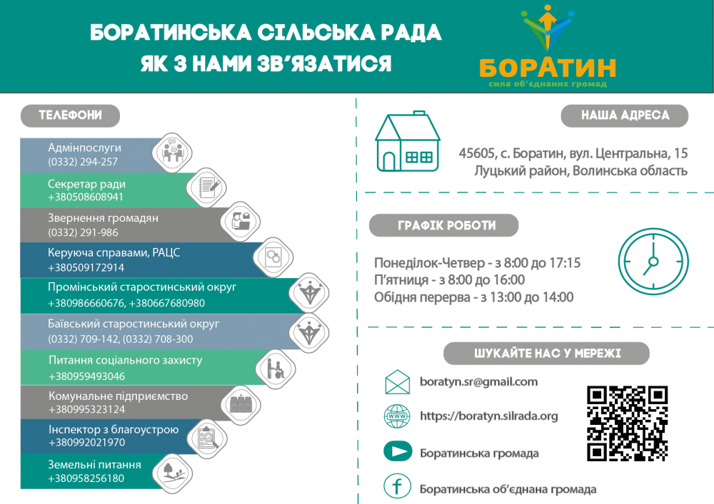 До 11 травня Боратинська сільська рада працює у дистанційному режимі, щоб уникнути ймовірного розповсюдження коронавірусу. Прийом громадян тимчасово не здійснюється. На період обмежувальних заходів виконавчі органи сільської ради надають консультації виключно в телефонному режимі та онлайн.
