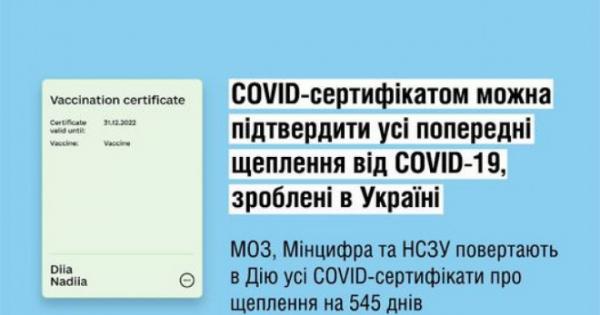 Міністерство охорони здоров'я України спільно з Міністерство цифрової трансформації України та НСЗУ Національна служба здоров'я України ухвалили рішення не видаляти з Дії цифровий сертифікат про вакцинацію проти COVID-19 протягом 545 днів від дати щеплення.