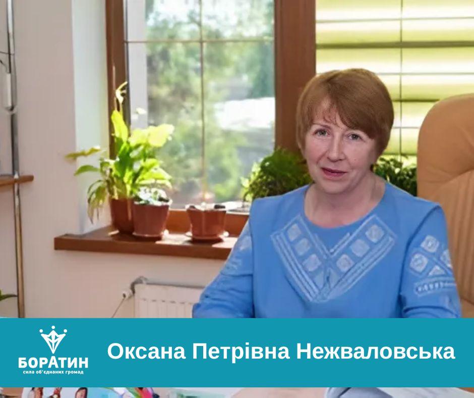 Оксана Петрівна Нежваловська, головний спеціаліст з реєстрації актів цивільного стану Боратинської сільської ради. За освітою вчитель початкових класів, майже 20 років працювала у Баївській школі. Свій шлях в ОМС розпочала з 2002 року.