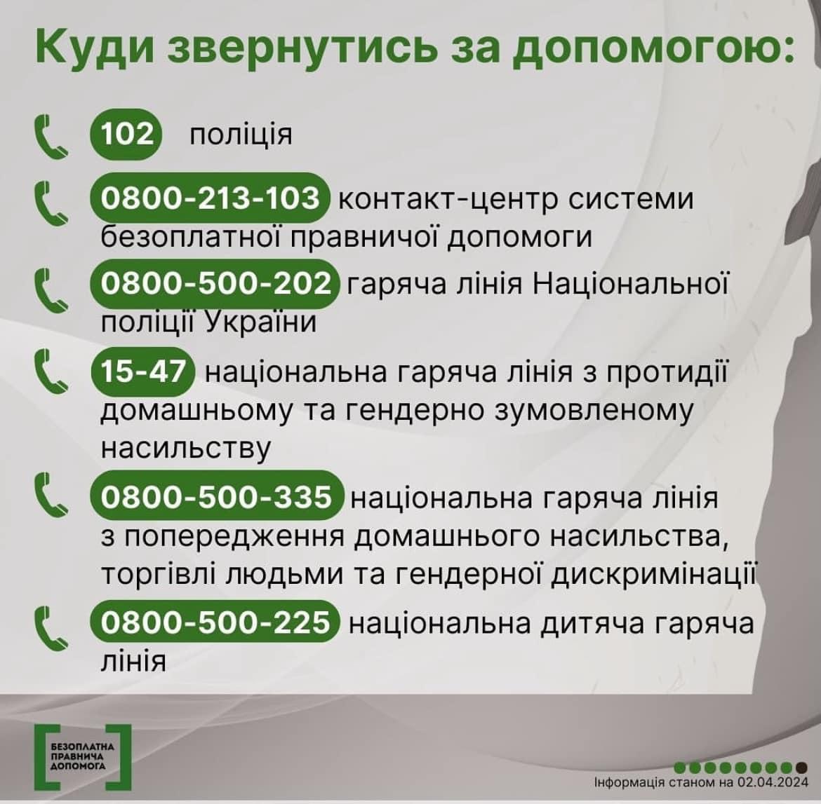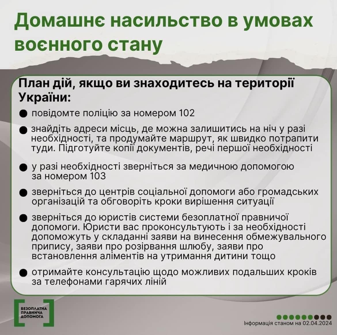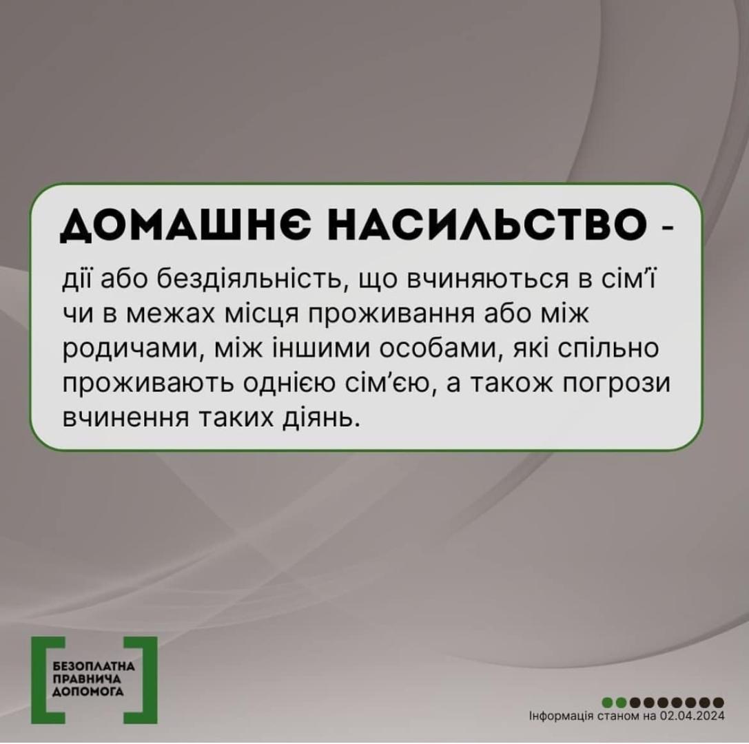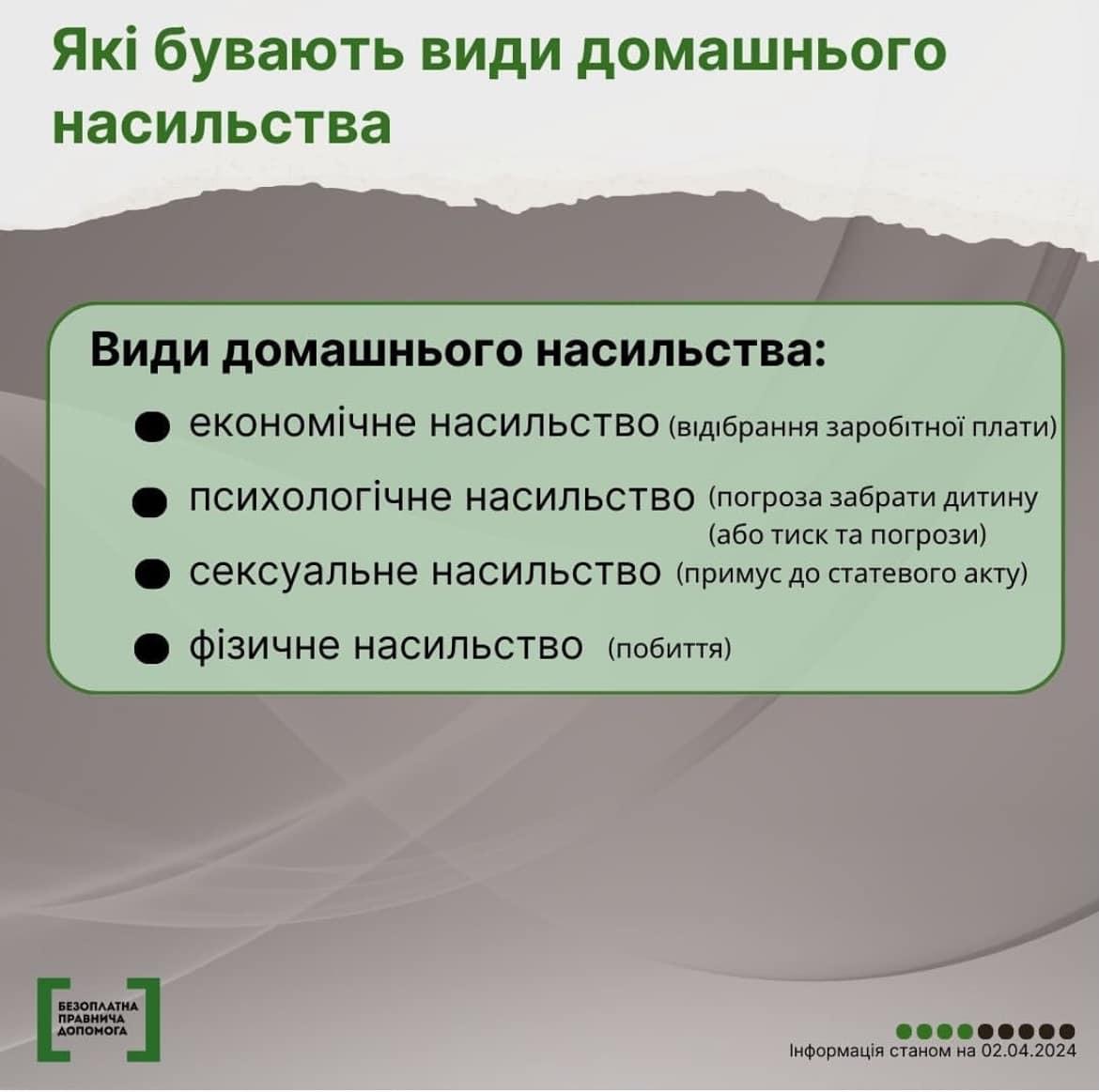 Дізнайтеся більше про види домашнього насильства та відповідальність за вчинення будь-якого з них на сайті Безоплатної правничої допомоги.