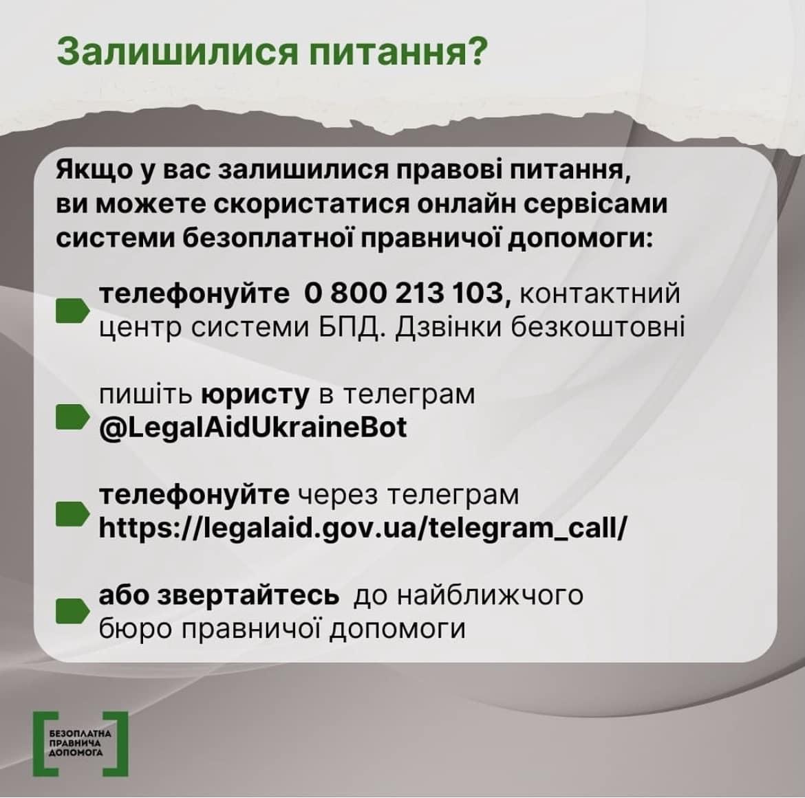 За додатковою інформацією звертайтесь до контакт-центру системи безоплатної правничої допомоги (будні з 8:00 до 18:00) за номером: 0 800 213 103. Дзвінки зі стаціонарних та мобільних телефонів у межах України безкоштовні.