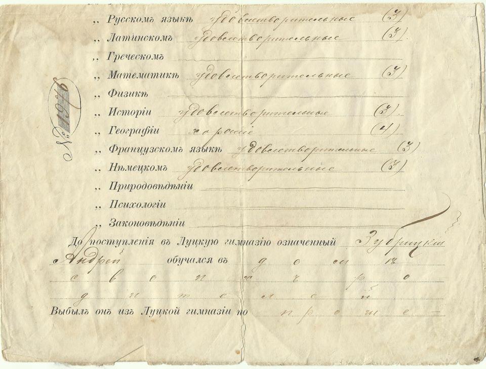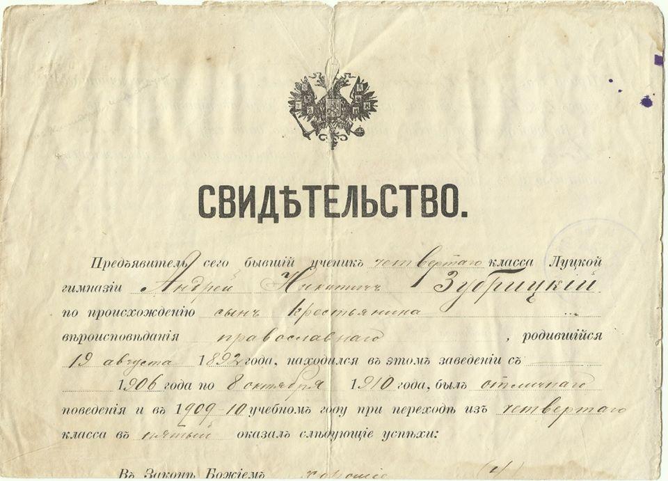 З 1906 по 8 жовтня 1910 навчався у Луцькій чоловічій гімназії, з якої, закінчивши 4 класи, вибув по «прошенію» батька. Судячи з свідоцтва № 1976, виданого 2 грудня 1910 року, учні четвертого класу в той час вивчали російську, німецьку, французьку та латинську мови, історію, географію, математику та Закон Божий, а також мали право «при поступлении в гражданскую службу, если имеют на это право по происхождению, не подвергатся испитанию для произвадства в первий класний чин». Напередодні Першої світової війни Андрій – вчитель державної школи в селі Колмів на Горохівщині. Збереглась фотографія Андрія у формі вчителя, зроблена в фотосалоні І.В. Острова в місті Берестечку.