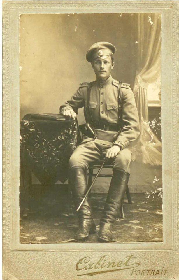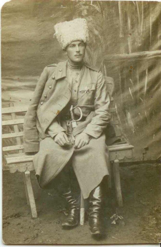 Після закінчення трьохмісячного навчання в 1-й Київській школі підготовки прапорщиків піхоти йому присвоєно звання прапорщика та відправлено на фронт. З розповідей бабусі брав участь у Брусиловському прориві 1916 року, де отримав поранення. Судячи з цифр на пагонах, які можна бачити на фотографії, зробленій у Москві, служив в 28 Полоцькому піхотному полку.
