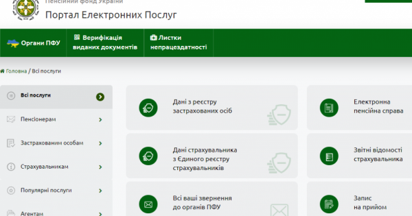 ● На веб-порталі Пенсійного фонду www.pfu.gov.ua потрібно обрати категорію «Портал електронних послуг» та перейти за відповідним посиланням https://portal.pfu.gov.ua