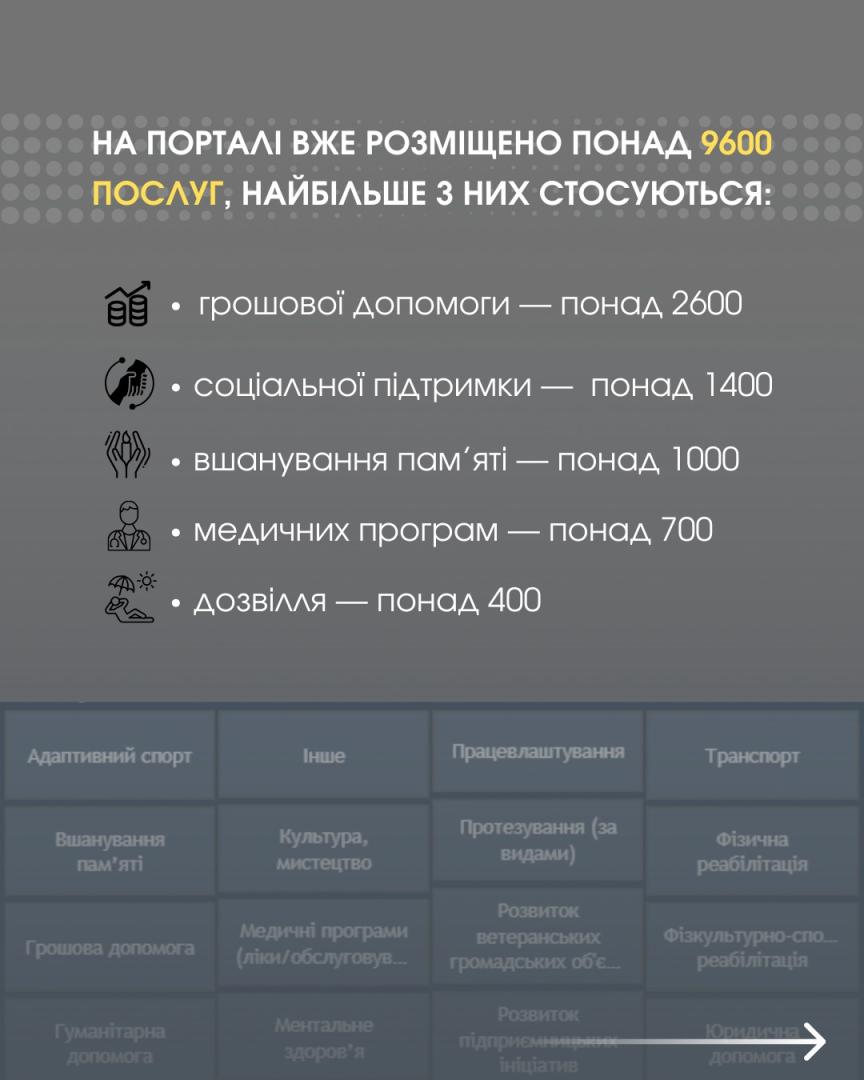 На порталі представлені різні послуги: від психологічної підтримки, медичних програм, патріотичного виховання, мистецтва до всього необхідного для розвитку ветеранських об’єднань та підприємницьких ініціатив ветеранів.