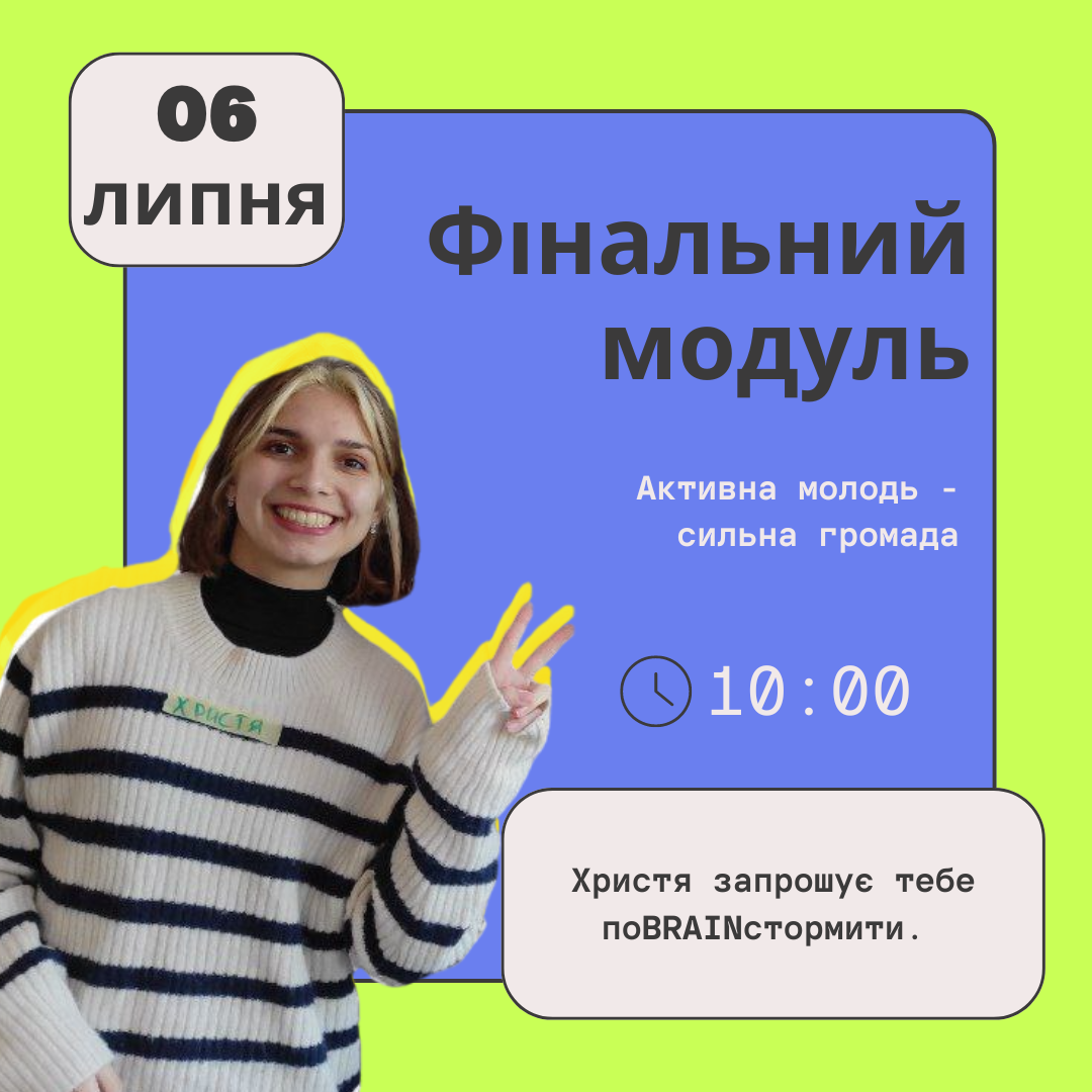 На останньому модулі молодь напрацьовуватиме подальші кроки розвитку молодіжної ради, які проблеми в молодіжній політиці можна вирішити в найближчому майбутньому, як покращити дозвілля для молоді громади.