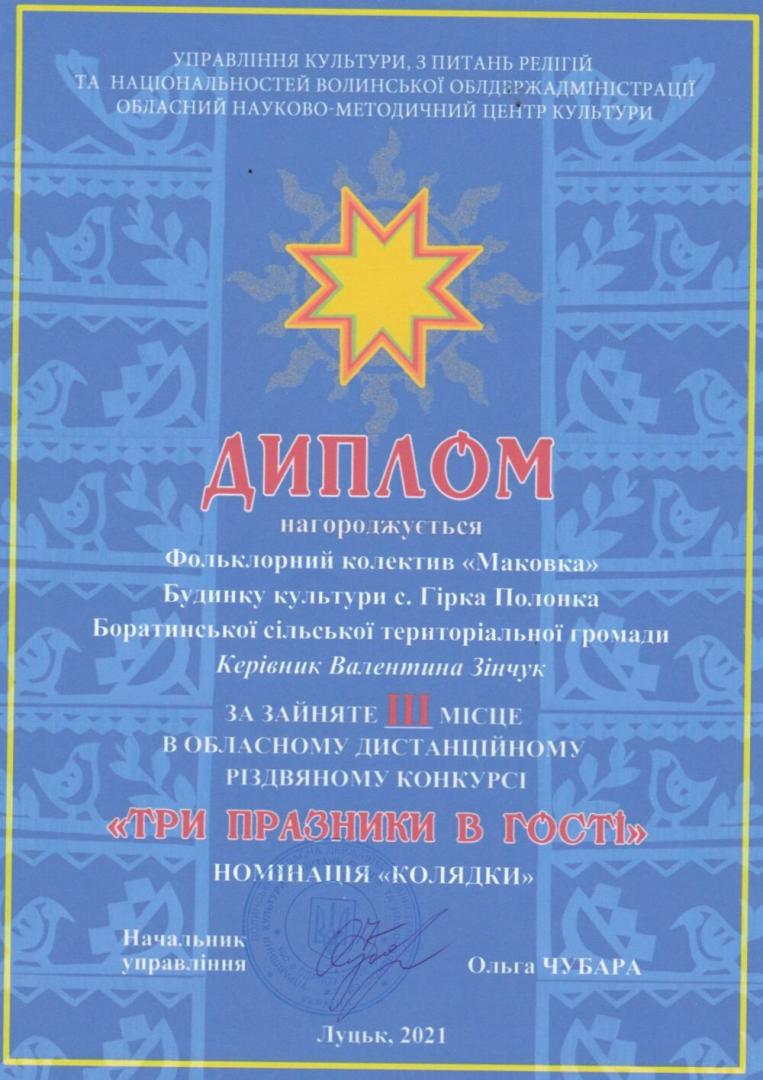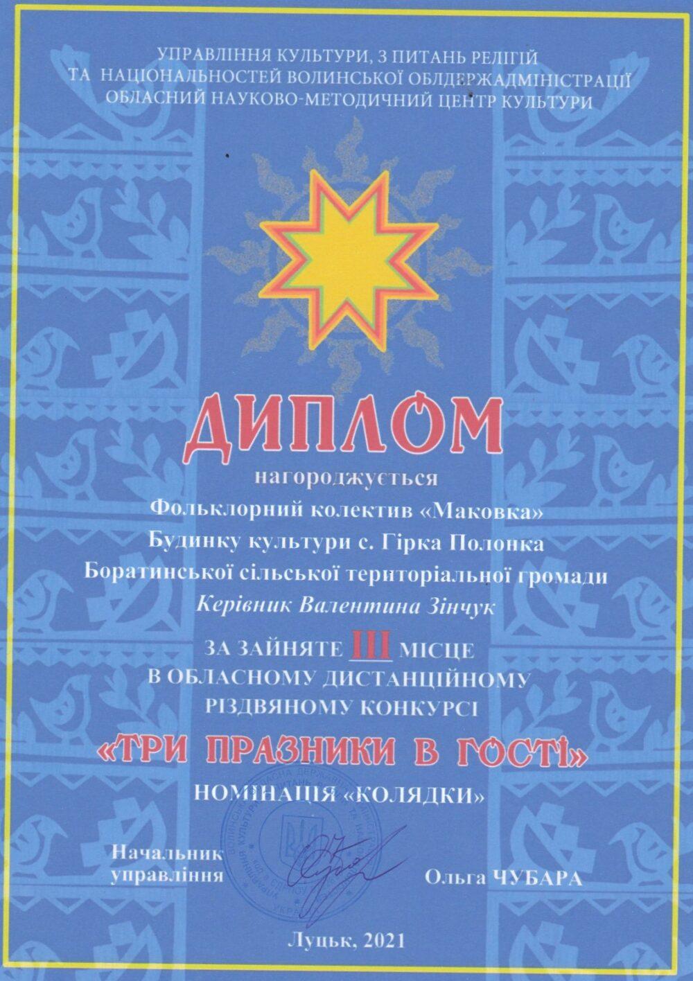 • Фольклорний колектив «Маковка» Будинку культури с. Гірка Полонка Боратинської сільської територіальної громади (керівниця Валентина Зінчук)