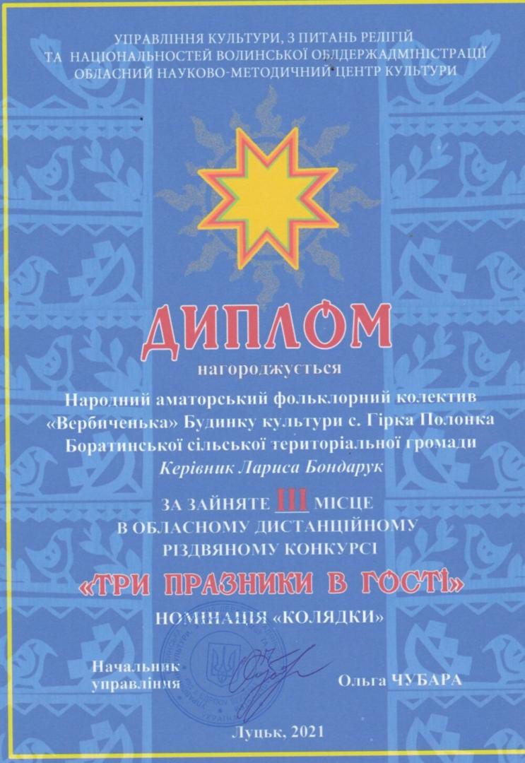 • Народний аматорський фольклорний колектив «Вербиченька» Будинку культури с. Гірка Полонка Боратинської сільської територіальної громади (керівниця Лариса Бондарук)