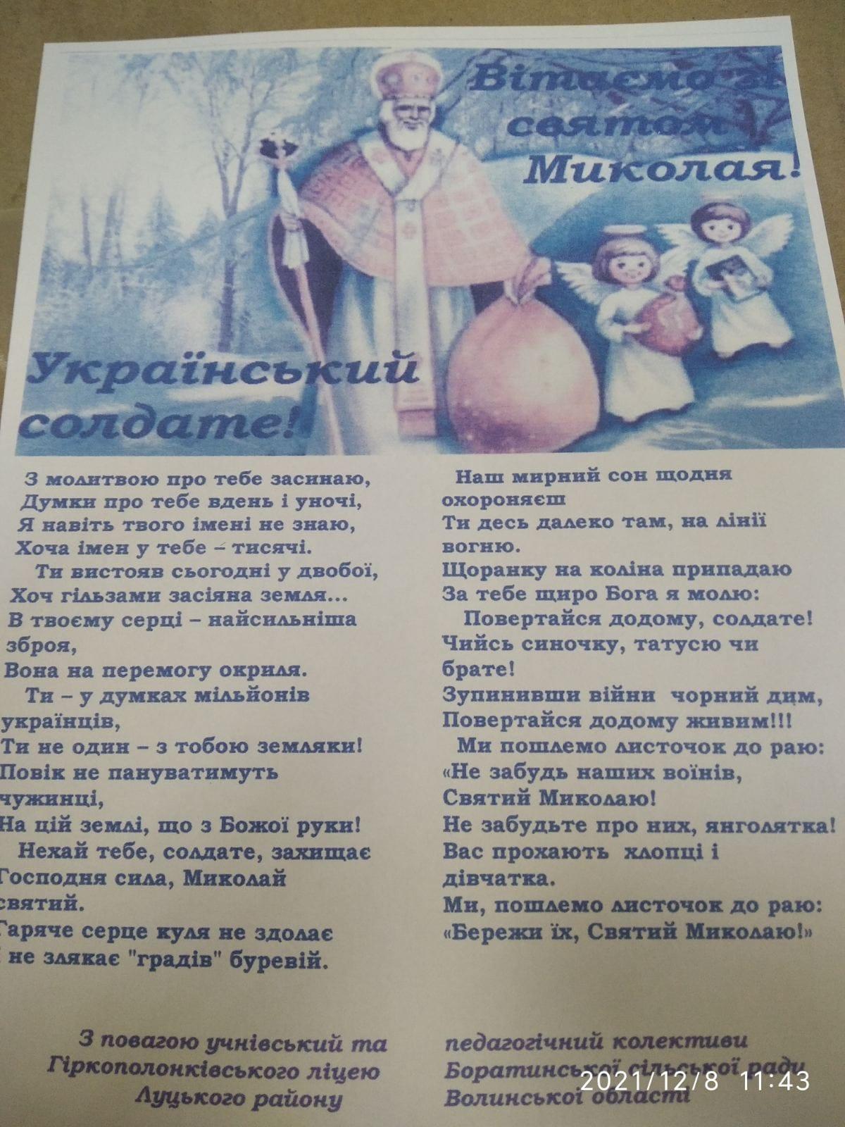 Представники Гіркополонківського ліцею кажуть, що поспішали, щоб зібрати посилку якнайшвидше: «Незабаром День святого Миколая - чарівне свято для малюків і дорослих, адже всі вони, без винятку, чекають на подарунки. Звісно, хочеться, щоб цей день був особливим і для наших військових, для тих, хто стоїть на варті нашого миру. Вклоняємося низько і дякуємо, бережи Вас Господь!».