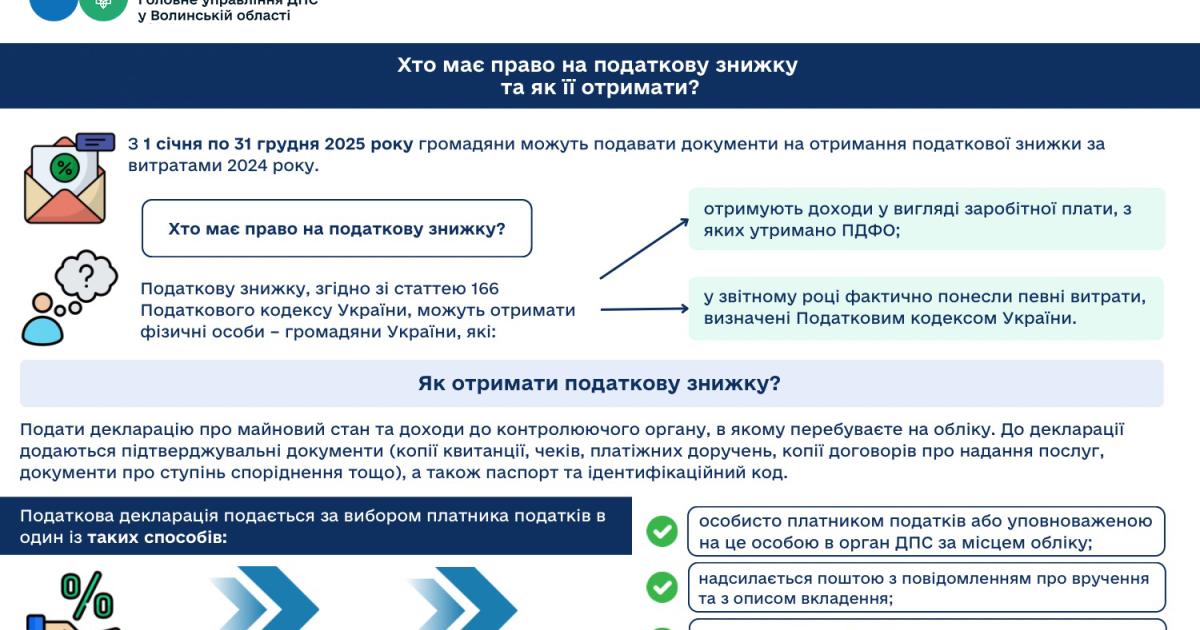 Головне управління ДПС у Волинській області нагадує: з 1 січня по 31 грудня 2025 року громадяни України можуть подати документи на отримання податкової знижки за витратами, здійсненими у 2024 році.