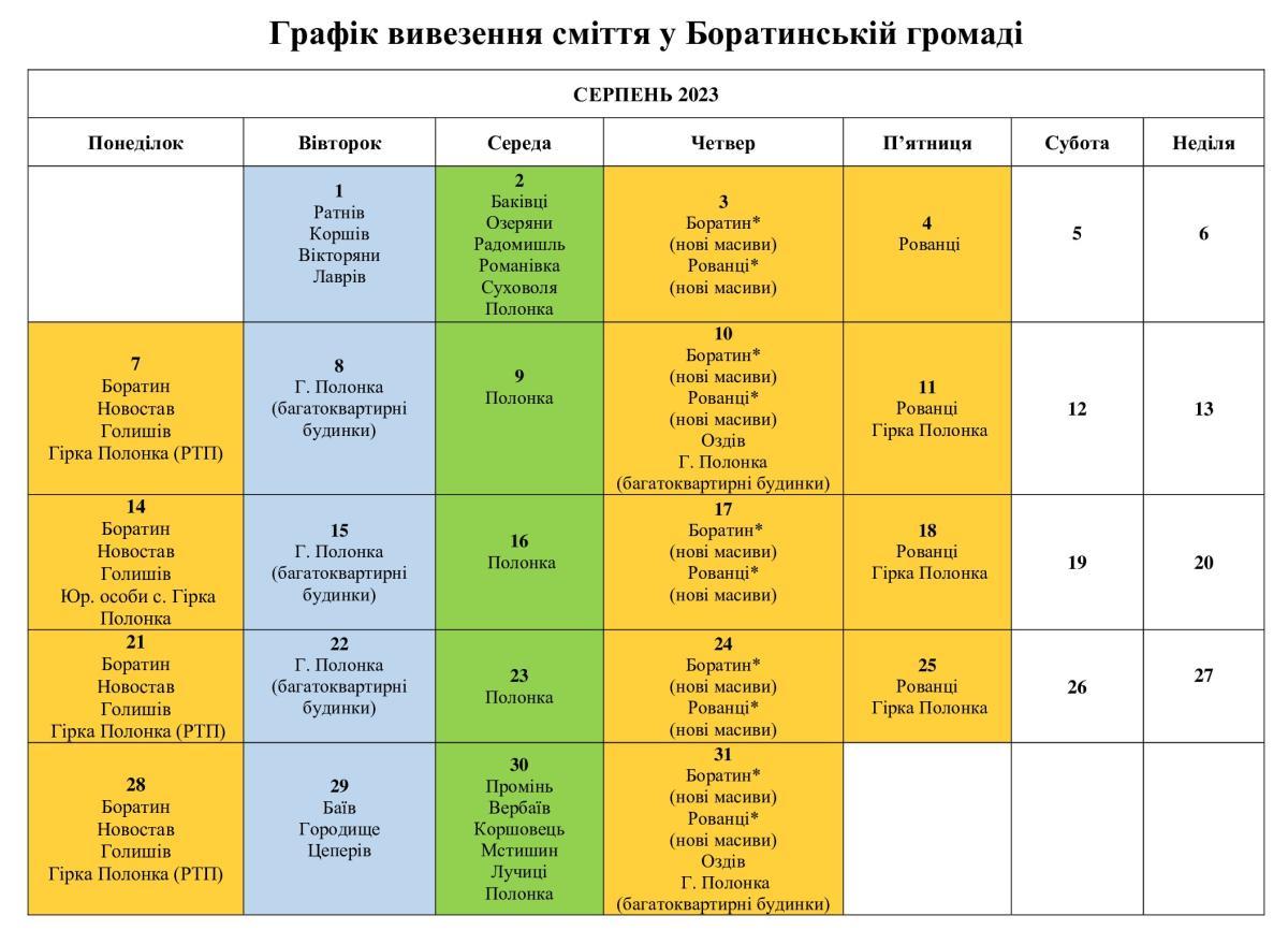 КП «Боратин» інформує про графік вивезення твердих побутових впродовж цього місяця.