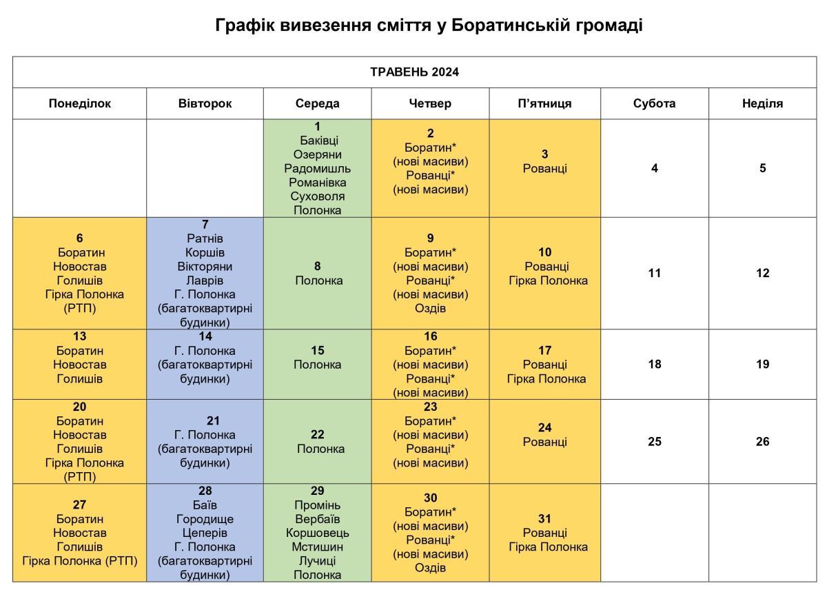 КП «Боратин» інформує про графік вивезення твердих побутових впродовж цього місяця