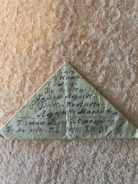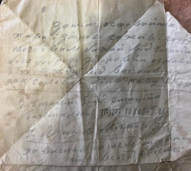Оставайтеса живи здорови, передаю вам свій поклін: тобі Марисько, і Соні доці, і до Пілганова батьку матері, і до Гоздова всім татові і мамі, і Сірожові, і Надії, Мішкови, живіт ни чим не журітся тільки аби дав Бог здоров’я, гляди себе і Соню. Затім оставайтеся живи здорови, я жив і здоров, того і вам бажаю, від Господа Бога здорові оставайтесь. Жду від вас отвіта, як соловей літа. Живи ні горуй!»