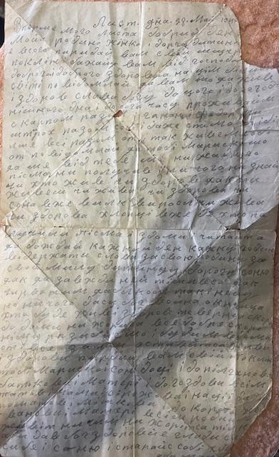 «Чи хто жив чи здоровий, чи Соня (дочка) вже велика виросла, бо хлопці вже дехто получили пісьма і з доми і читали, а я дожидаю кожний день, кожну годину за свою милу дитину і дорогу Соню, так я завжди нею тішився, но ни чого, дасть Бог скоро німців розиб’ємо і будим вдома от і все.