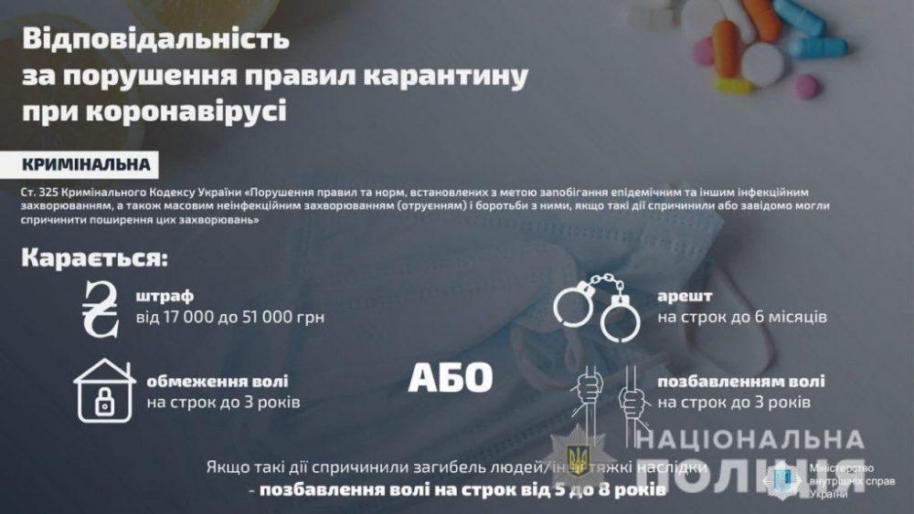 Також нагадуємо, що Законом України встановлена відповідальність за порушення санітарних норм під час поширення коронавірусної інфекції. Кодекс України про адміністративні правопорушення доповнено ст. 44-3 «Порушення правил щодо карантину людей», згідно якої порушення правил щодо карантину людей, санітарно-гігієнічних, санітарно-протиепідемічних правил і норм, передбачених Законом України «Про захист населення від інфекційних хвороб», іншими актами законодавства, а також рішень органів місцевого самоврядування з питань боротьби з інфекційними захворюваннями, тягне за собою накладення штрафу на громадян від однієї до двох тисяч неоподатковуваних мінімумів доходів громадян, на посадових осіб – у розмірі від двох до десяти тисяч неоподатковуваних мінімумів доходів громадян. Тобто, адміністративна відповідальність встановлена за самовільне залишення місця обсервації (карантину) особою, яка може бути інфікована коронавірусною хворобою COVID-19.