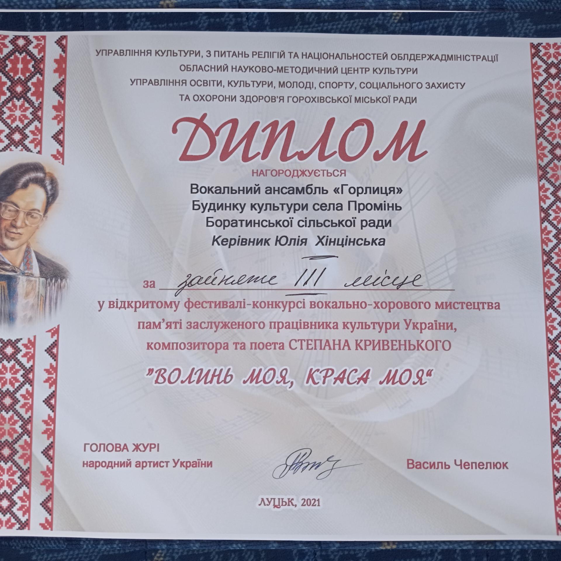 Боратинську громаду на фестивалі представив вокальний ансамбль «Горлиця» села Промінь. Колектив вразив журі та гостей майстерністю і проникливим виконанням, здобувши у підсумку третє місце у номінації «Вокальний ансамбль».