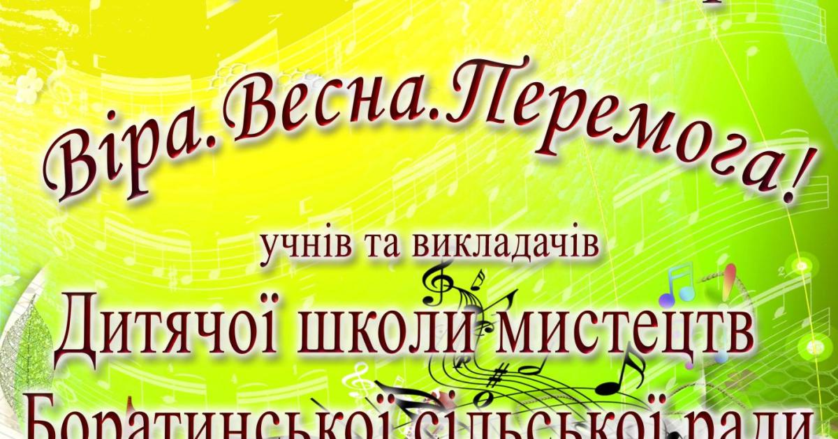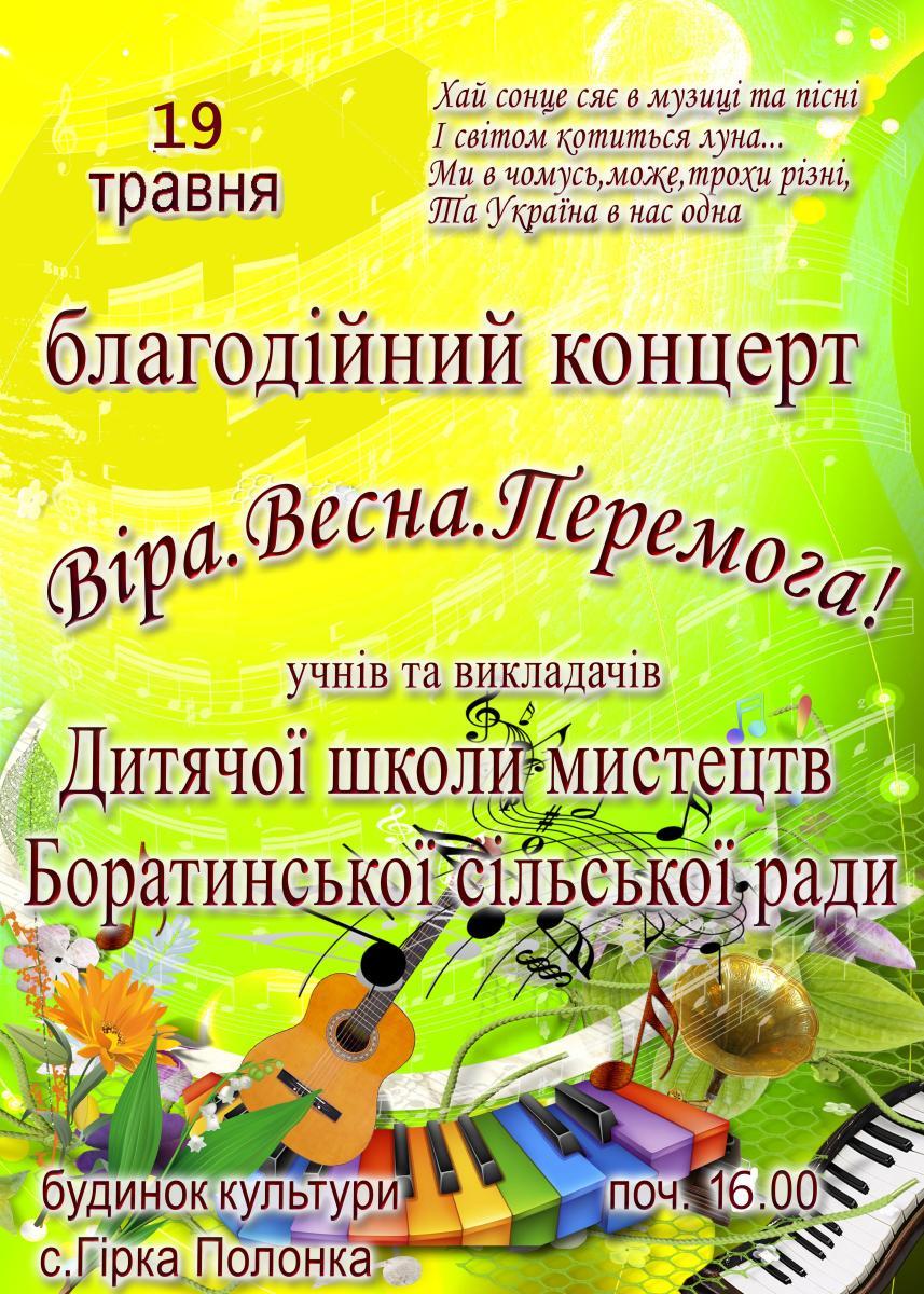 Повідомляємо, що благодійний концерт під назвою «Віра. Весна. Перемога!», який було анонсовано раніше, перенесено на 19 травня о 16:00. Концерт відбудеться у будинку культури с. Гірка Полонка. Для вас виступатимуть учні та викладачі дитячої школи мистецтв Боратинської сільської ради. Запрошуємо усіх охочих подивитися та послухати творчі виступи юних артистів нашої громади.