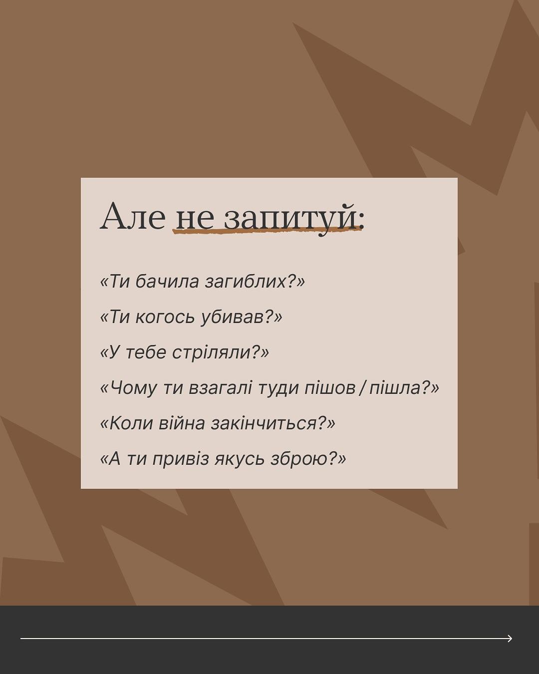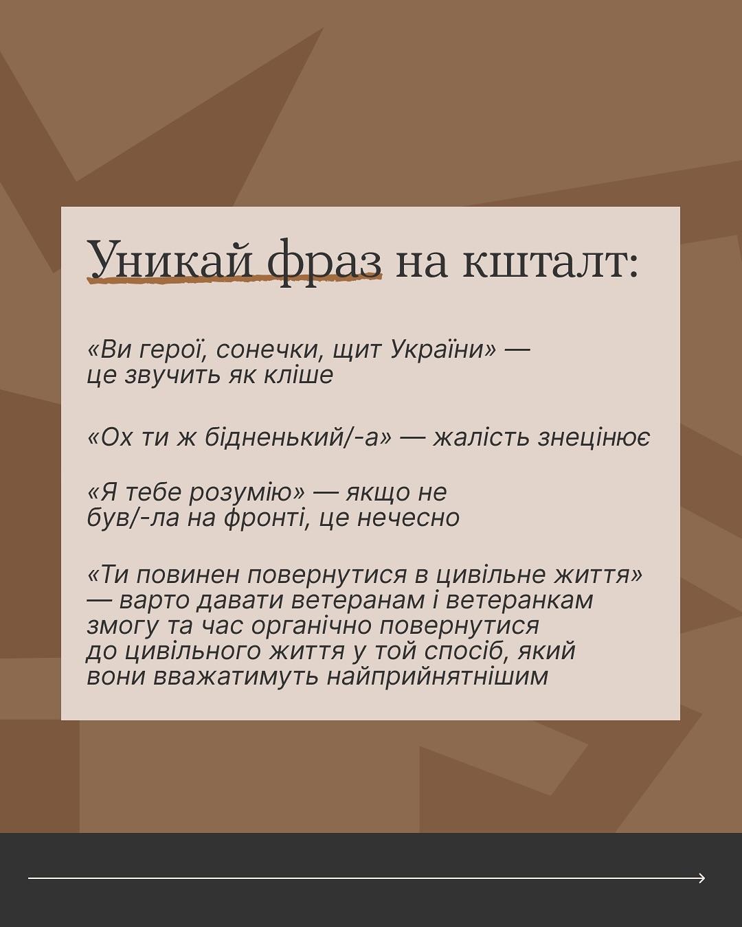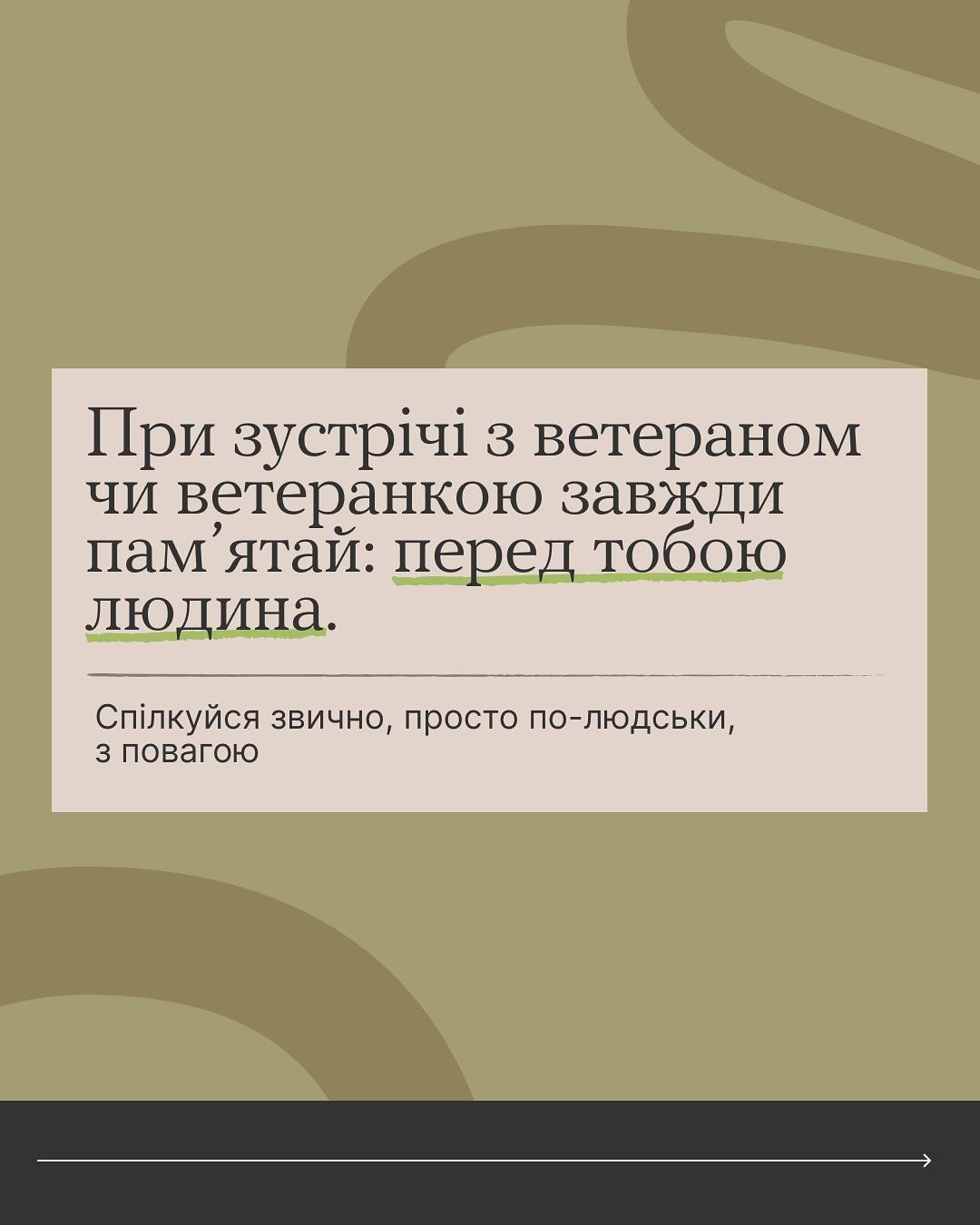 У сьогоднішніх реаліях дедалі більше Захисників і Захисниць України повертаються до мирного життя, і кожному з нас важливо вміти підтримати їх словом та повагою. Часто люди переживають, що в розмові можуть сказати щось недоречне або випадково зачепити болючу тему. Для багатьох людей спілкування з ветеранами та ветеранками може викликати хвилювання — інколи здається, що випадково можна сказати щось недоречне.