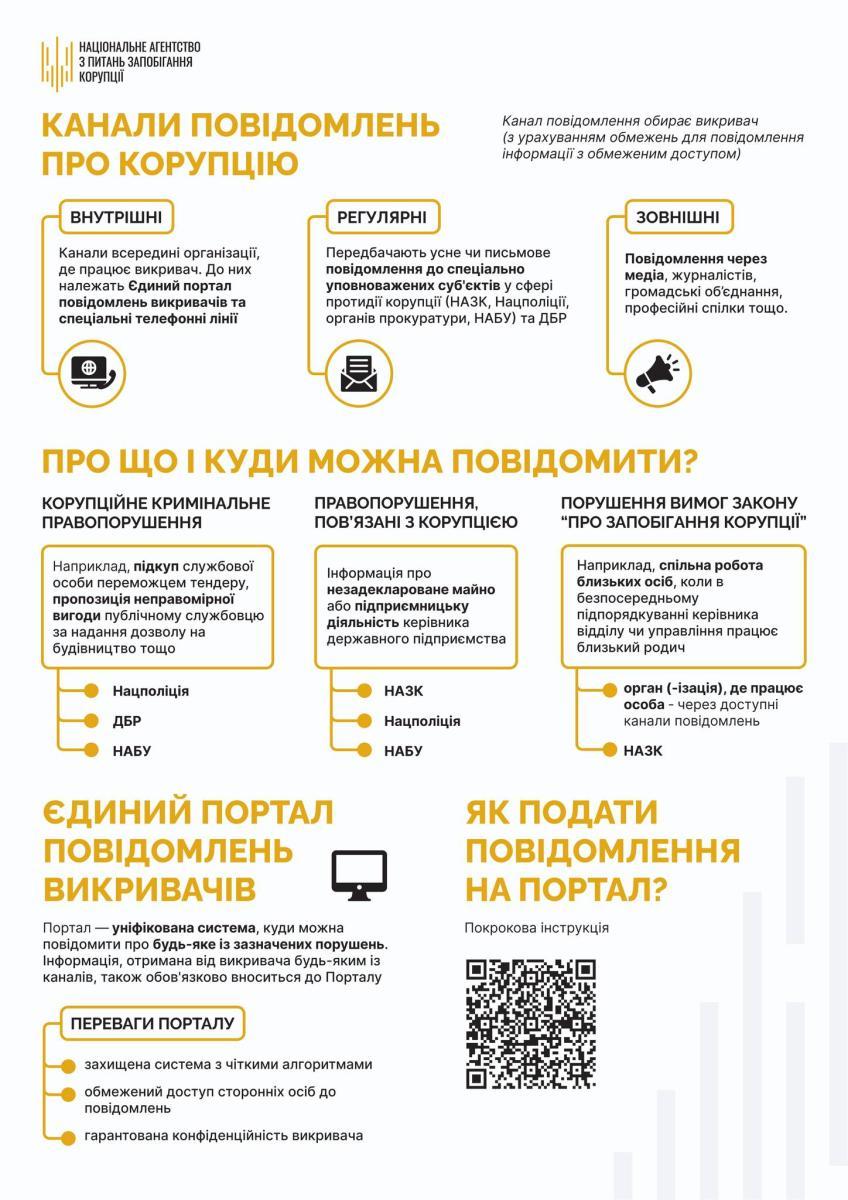 Також НАЗК підготувало інфографіку з іншими каналами повідомлень про корупцію, з якою можете ознайомитися нижче.