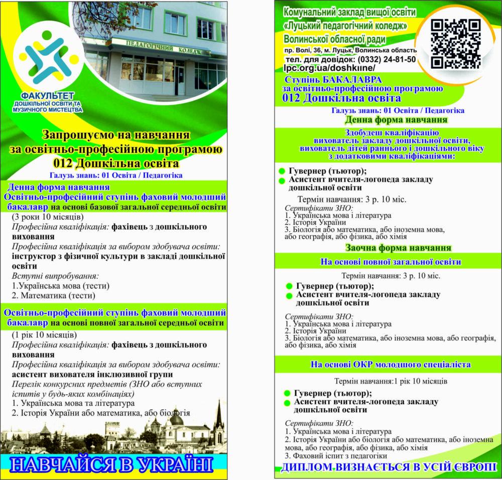 • 025 «Музичне мистецтво»«Ми гарантуємо високоякісну освіту, диплом європейського зразка та працевлаштування за фахом. Детальна інформація подана у флаєрах, – йдеться у повідомленні вишу. – Луцький педагогічний коледж гордиться своїми випускниками, які є агентами змін у Боратинській громаді та натхненно працюють задля її процвітання. Запрошуємо на навчання випускників 9 та 11 класів. Допоможіть своїм учням, дітям, друзям, знайомим не проґавити свій шанс!»
