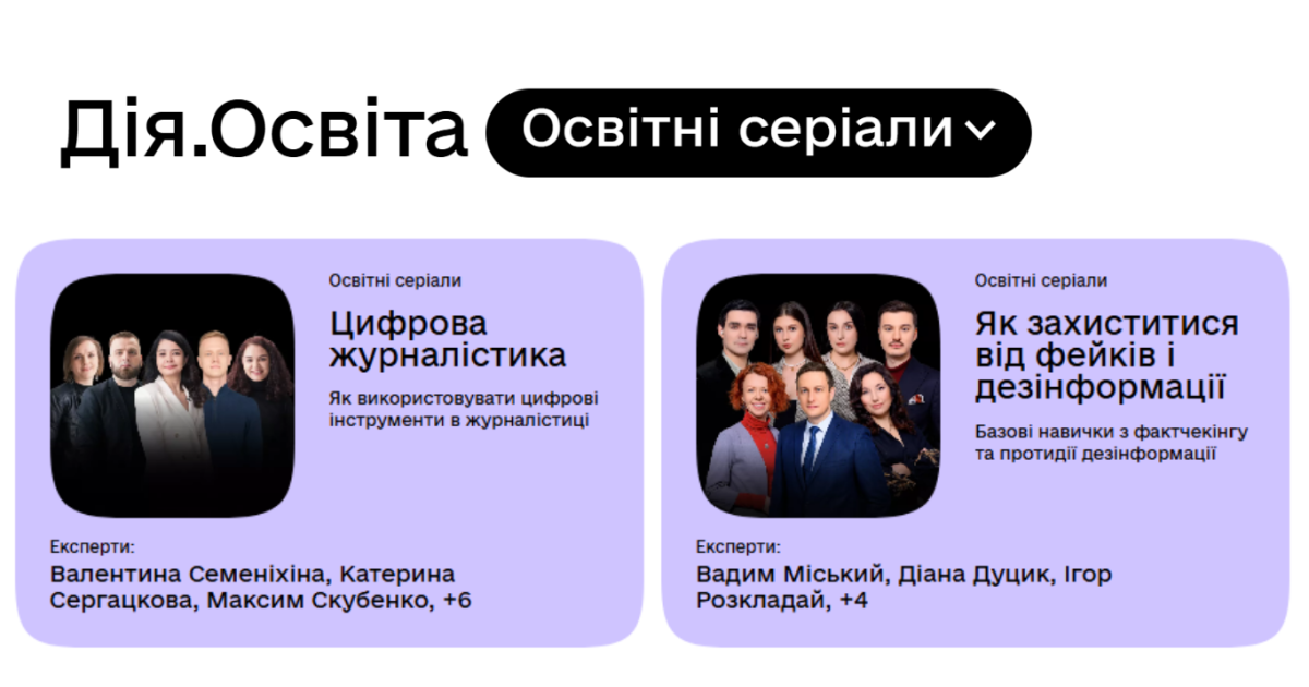 - «Як захиститися від фейків і дезінформації» – освітній серіал, що допоможе набути базових навичок фактчекінгу, медійної та інформаційної грамотності. Крім того, глядачі навчаться розпізнавати неправдиву інформацію, пропаганду та теорії змов, а також протидіяти їм. Пройти курс: https://osvita.diia.gov.ua/courses/how-to-protect-yourself-from-fakes-and-disinformation