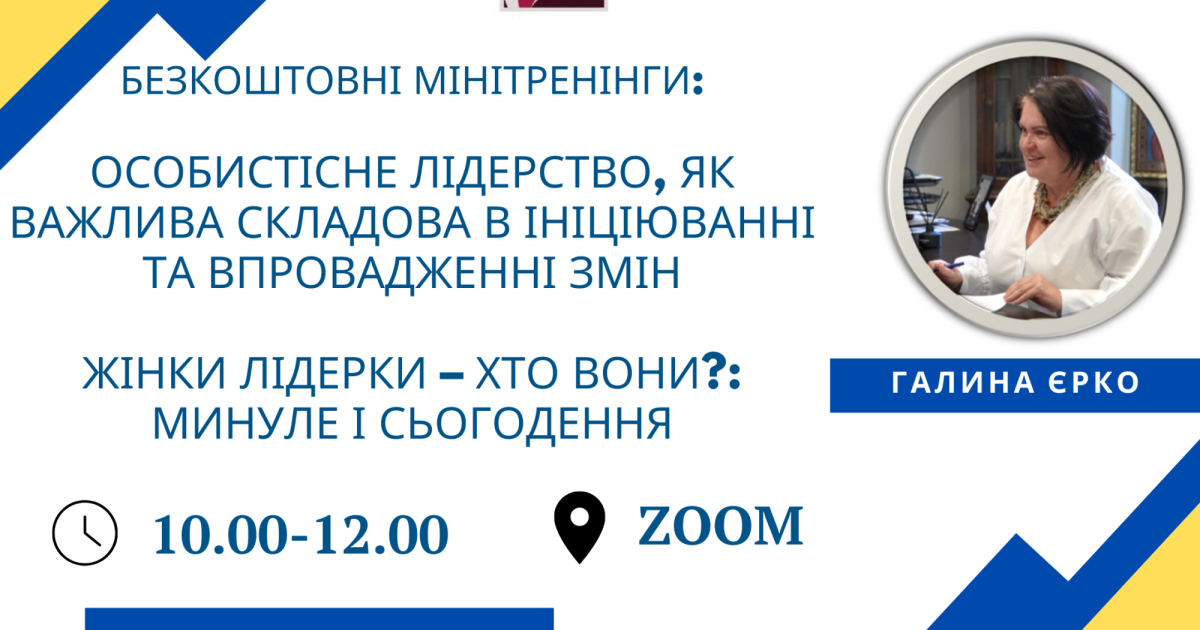 Під час безкоштовного онлайн мінітренінгу «Особистісне лідерство, як важлива складова в ініціюванні та впровадженні змін» спікерка Галина Єрко розповість про ключові елементи у досягненні успіху як на індивідуальному, так і на організаційному рівнях.
