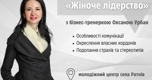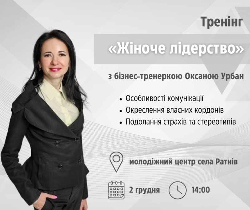 Аби поговорити про актуальні виклики та зробити спільний крок назустріч їх подоланню, запрошуємо взяти участь у тренінгу «Жіноче лідерство», що відбудеться 2 грудня о 14:00 у молодіжному центрі села Ратнів. Його проводитиме Оксана Урбан — бізнес-тренерка, яка має тренерський досвід більше десяти років, а у 2021 році була національним консультантом з питань лідерства проєкту UNDP. Вона поділиться з вами особливостями комунікації, окреслення власних кордонів та подолання страхів та стереотипів.