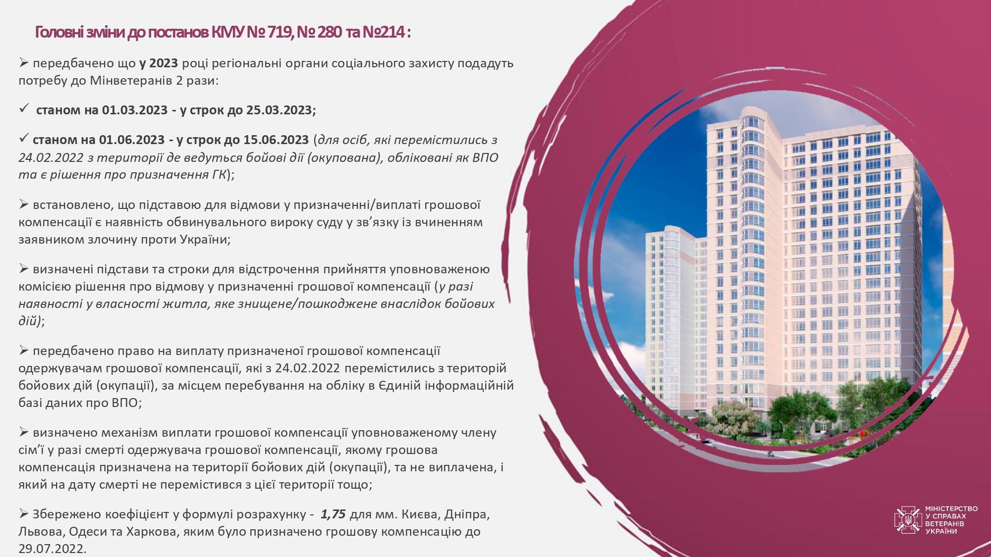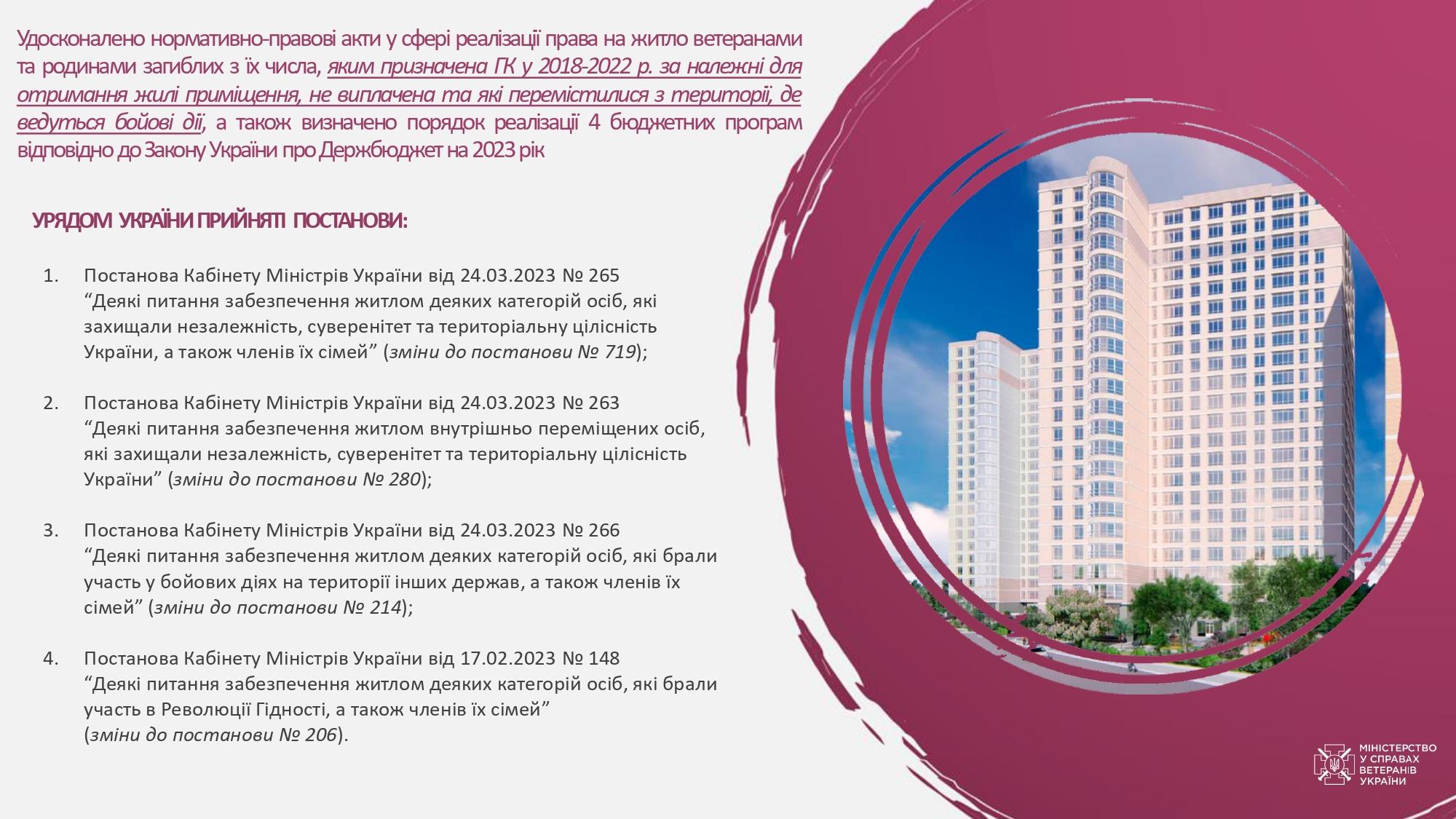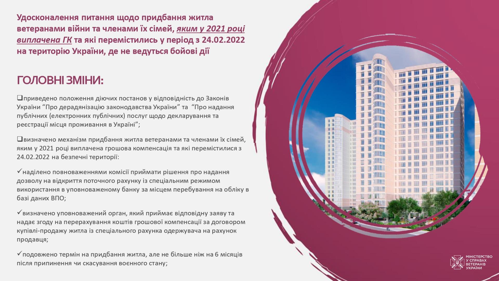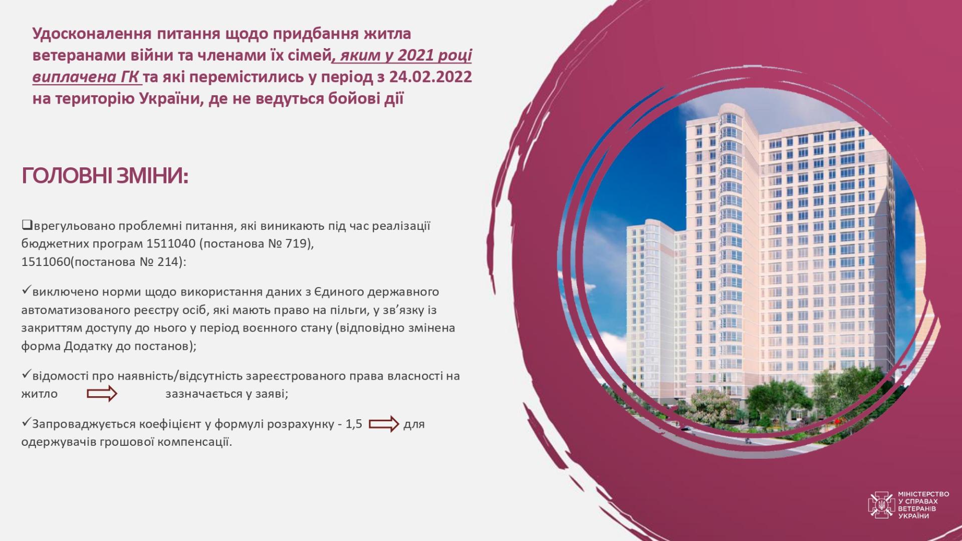 Зазначимо, що у березні цього року за ініціативи Мінветеранів Уряд вніс зміни до постанов КМУ №№719, 280 та 214, якими удосконалив порядки виплати грошової компенсації для придбання житла ветеранами та членами їхніх сімей.