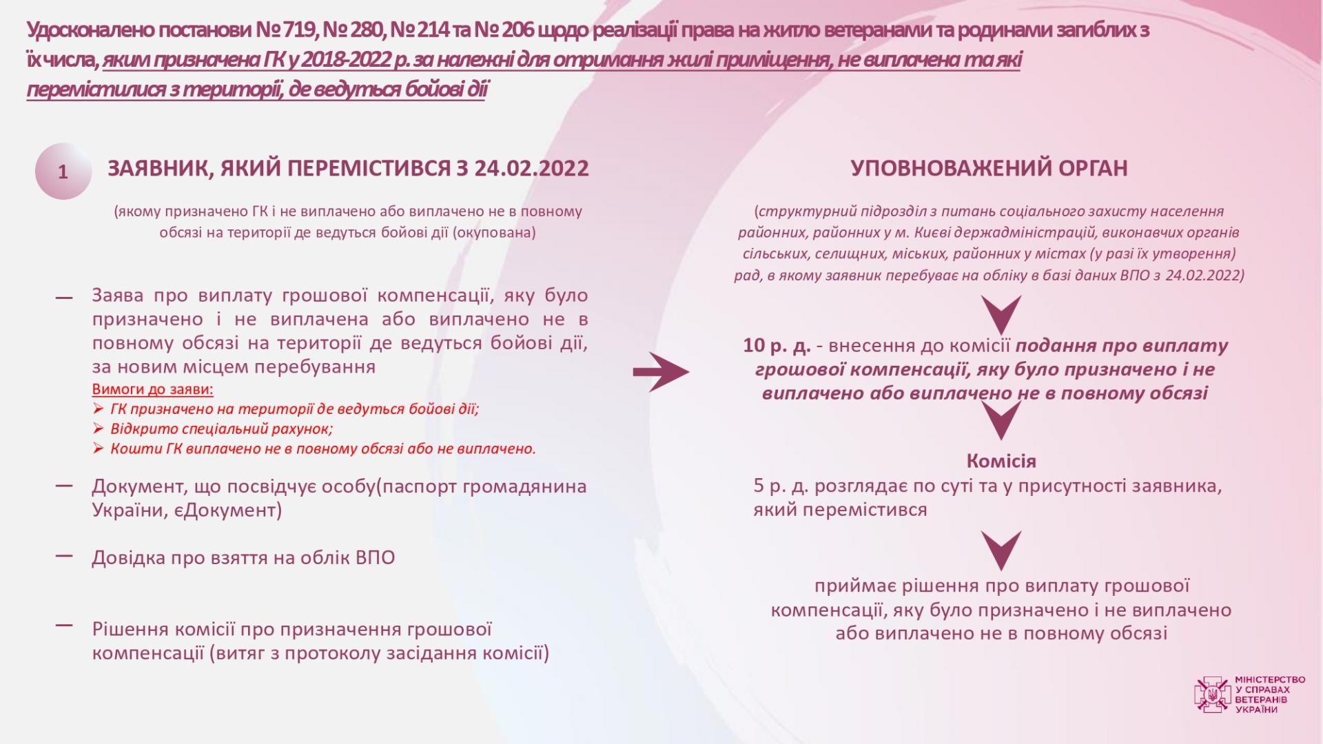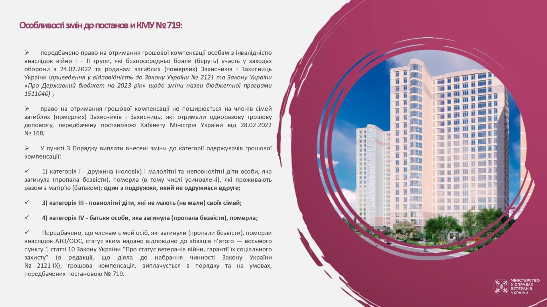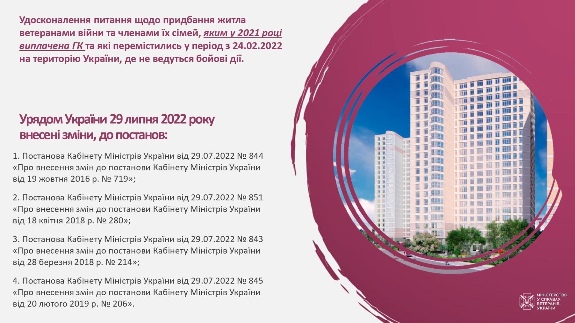 Зазначимо, що у березні цього року за ініціативи Мінветеранів Уряд вніс зміни до постанов КМУ №№719, 280 та 214, якими удосконалив порядки виплати грошової компенсації для придбання житла ветеранами та членами їхніх сімей.