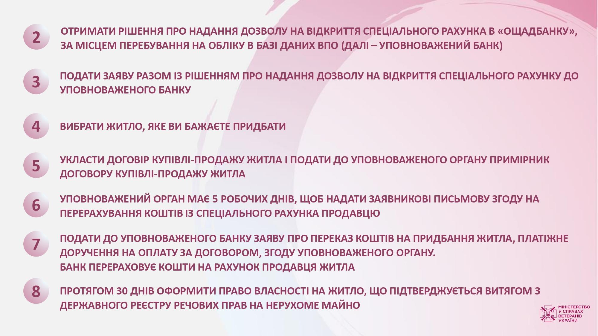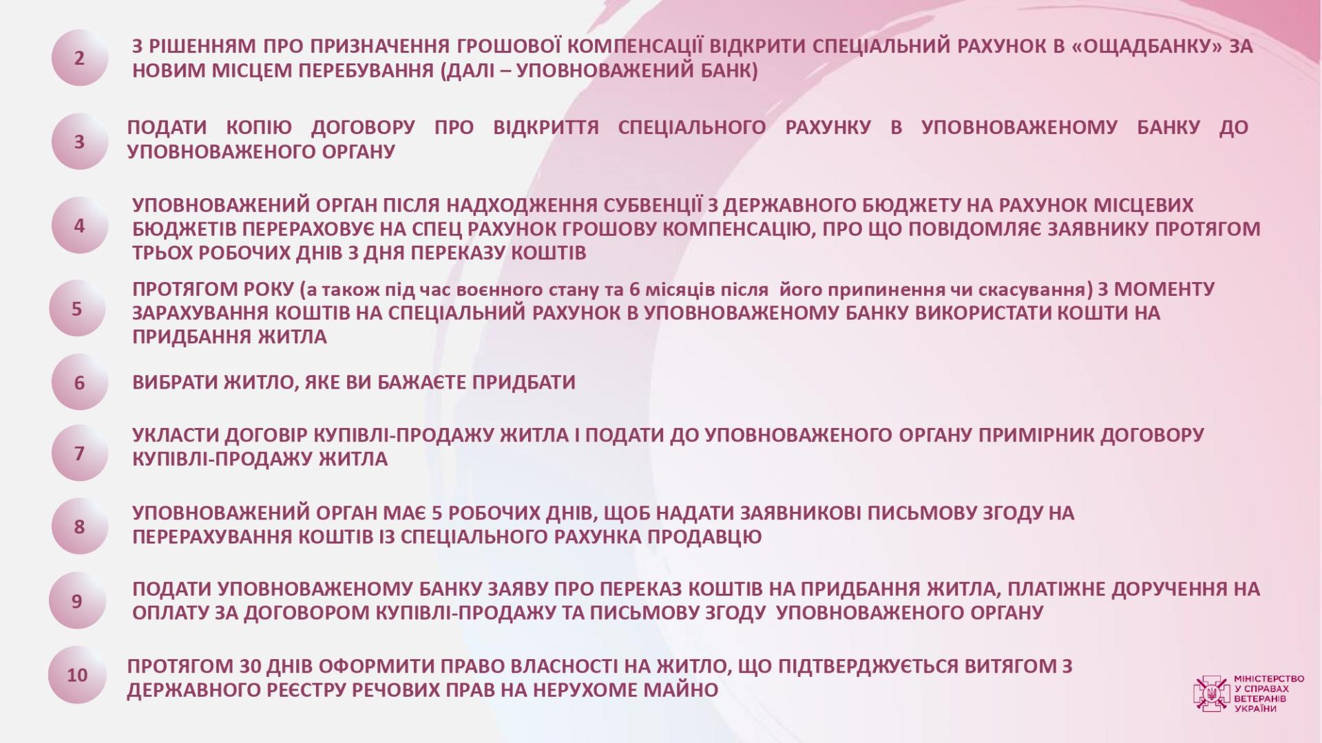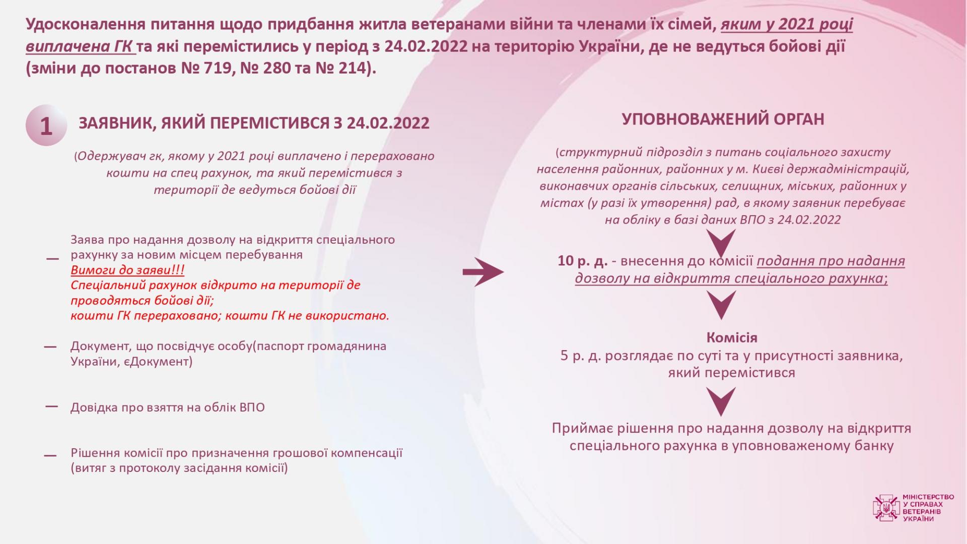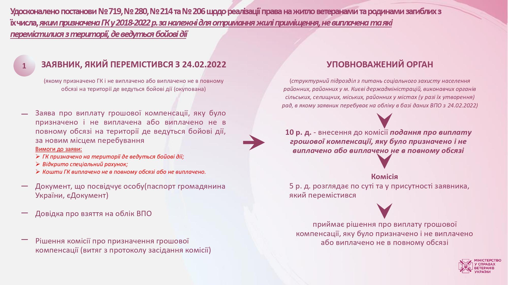 Зазначимо, що у березні цього року за ініціативи Мінветеранів Уряд вніс зміни до постанов КМУ №№719, 280 та 214, якими удосконалив порядки виплати грошової компенсації для придбання житла ветеранами та членами їхніх сімей.