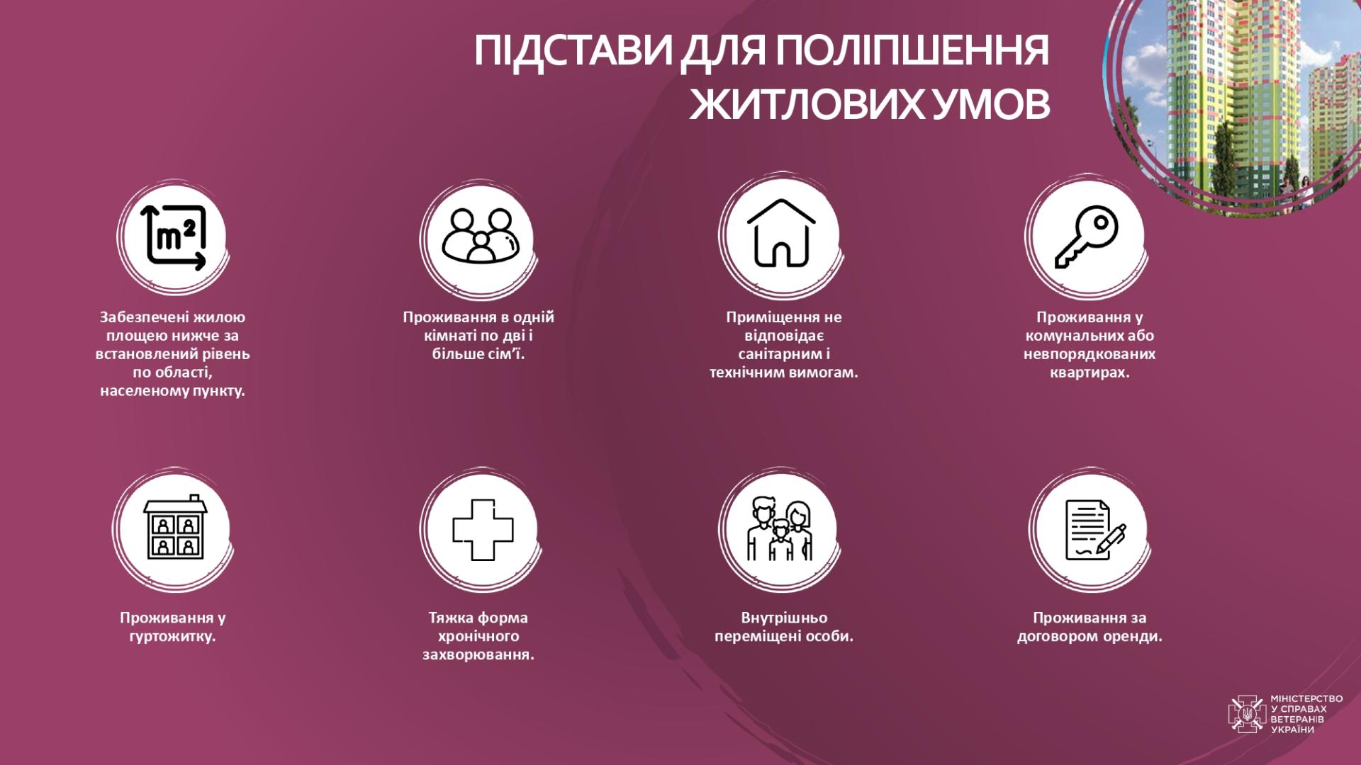 У наведеній нижче інфографіці або за цим посиланням Інфографіка щодо актуальних питань із забезпечення житлом ветеранів та членів їхніх сімей.pdf ветерани на члени їхніх родин можуть отримати детальну інформацію щодо житлових питань, зокрема: