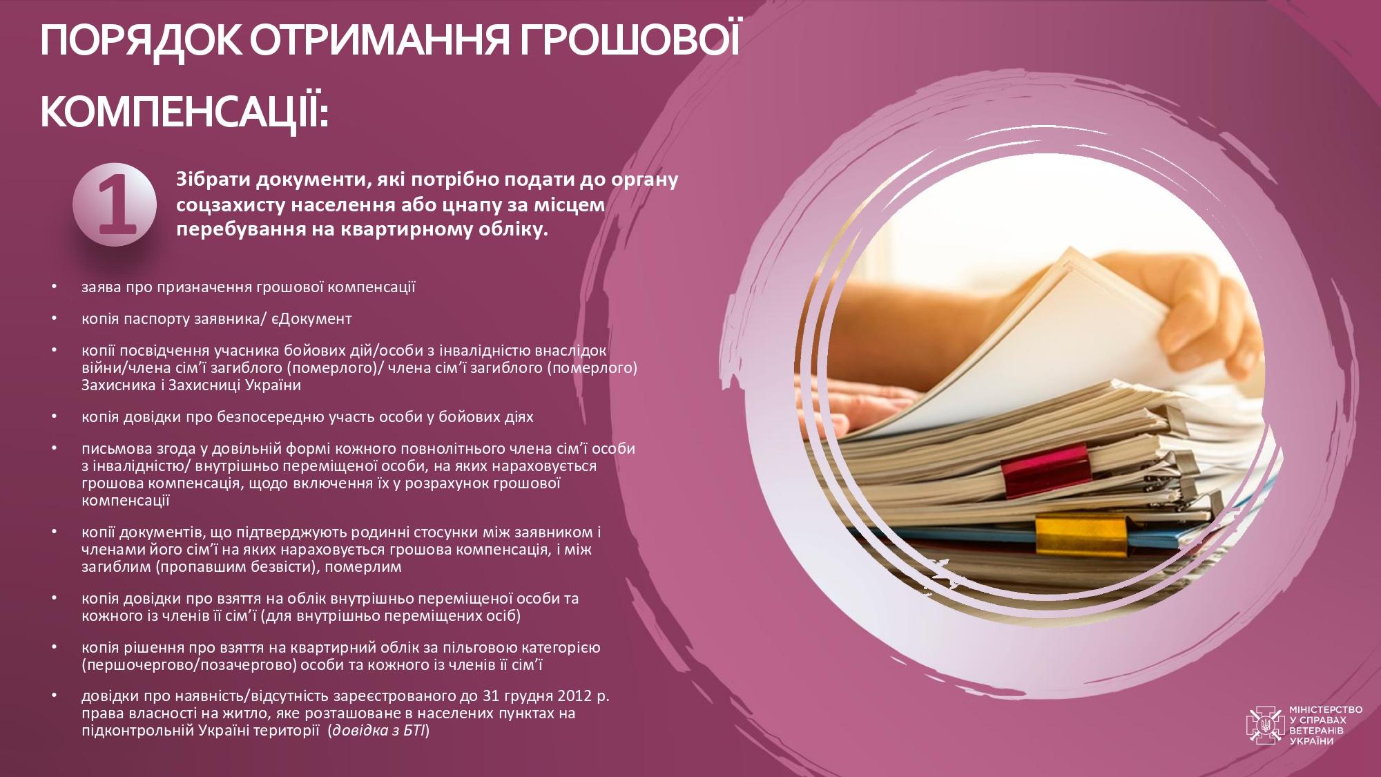 - Який перелік документів потрібно подати для призначення грошової компенсації?
