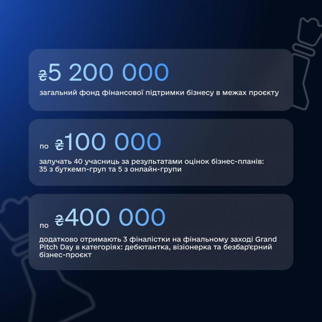 40 учасниць, які найкраще продемонструють себе під час навчання, отримають по 100 тисяч гривень на розвиток бізнесу, а 3 фіналістки – додатково по 400 тисяч гривень.