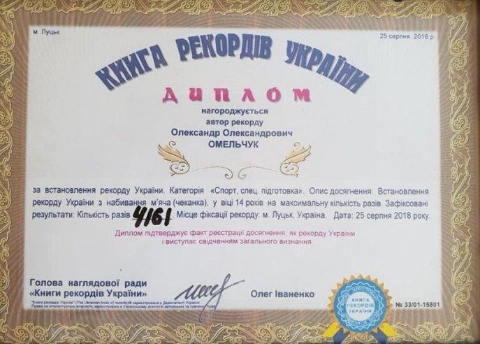 Понад півгодини часу (37 хвилин 47,27 секунд) Сашку Омельчуку знадобилося, щоб встановити рекорд. Зафіксований результат – 4161 раз був занесений до «Книги рекордів України». Сам Сашко результатом задоволений і тепер мріє стати всесвітньовідомим футболістом, який прославить Україну.