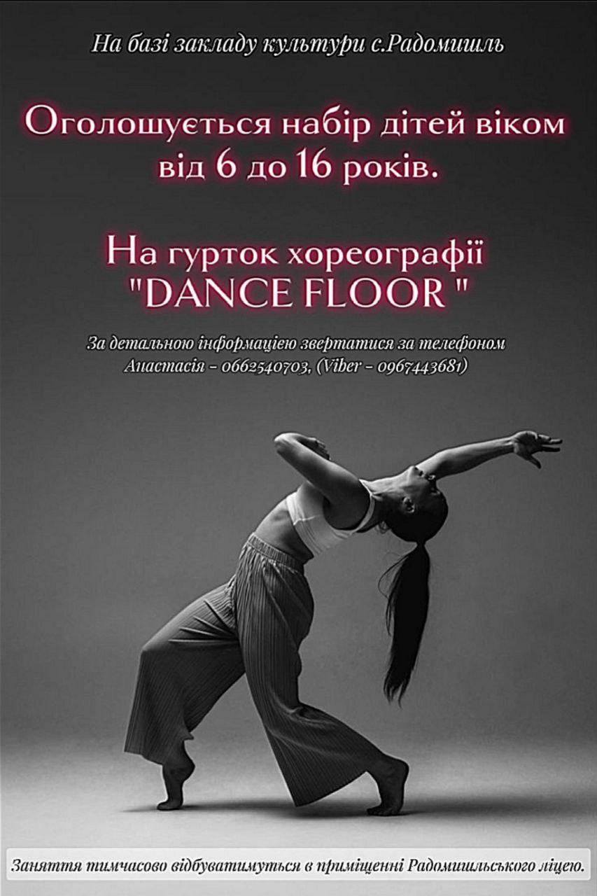 Оголошено набір у танцювальний гурток «DANCE FLOOR». Покращити свої навички танцю можуть діти віком від 6 до 16 років. Заняття тимчасово проходитимуть в приміщенні Радомишльського ліцею, а пізніше будуть проводитися на базі закладу культури села Радомишль.