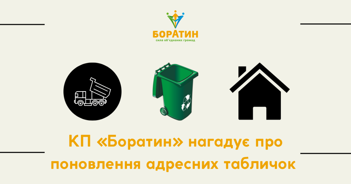 КП «Боратин» нагадує про необхідність поновити, написати чи встановити адресні таблички на будинках чи огорожах своїх домогосподарств (з номером будинку та назвою вулиці), або зробити відповідне маркування на сміттєвих контейнерах.