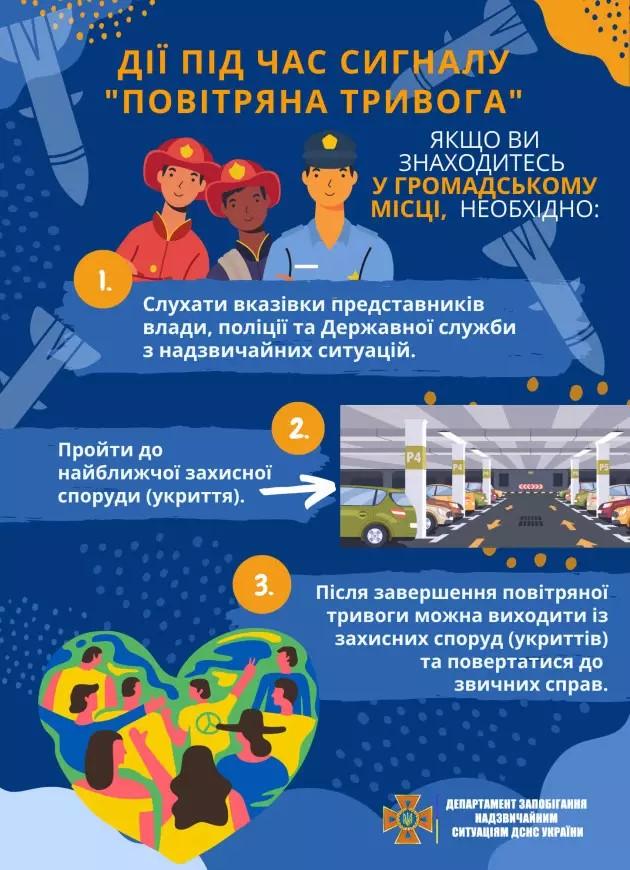 Якщо звучить сигнал «Повітряна тривога» – негайно слідуйте до найближчого укриття. Якщо не встигли добігти до нього, то негайно перейдіть у приміщення без вікон, скористайтеся правилом «двох стін».